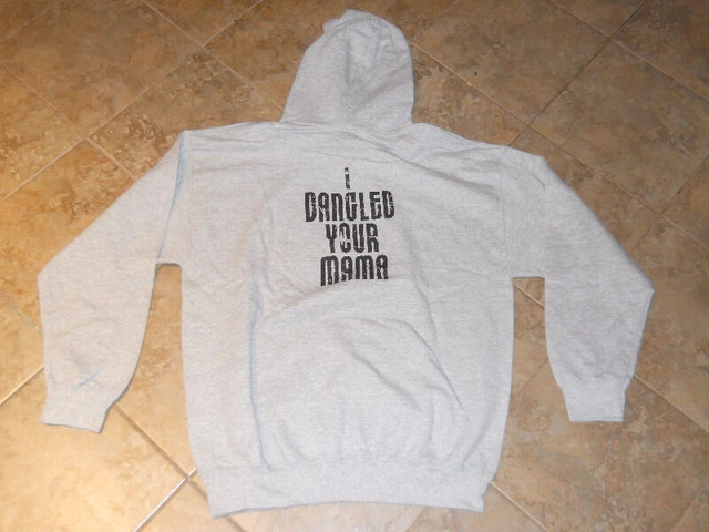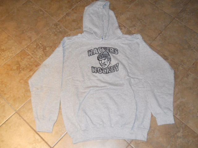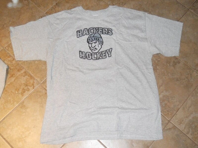 These are new shirts with the logo Hackers Hockey. On the back of the shirt it says I Dangled your Mama. Available as grey or black t shirt, grey or black long sleeve top or grey or black hoodie. Original design. Pick up in Etobicoke, Bloor West. T shirts - 10.00 Long Sleeve shirts 15.00 Hoodie 20.00 Assorted mens sizes esp. large and XL
