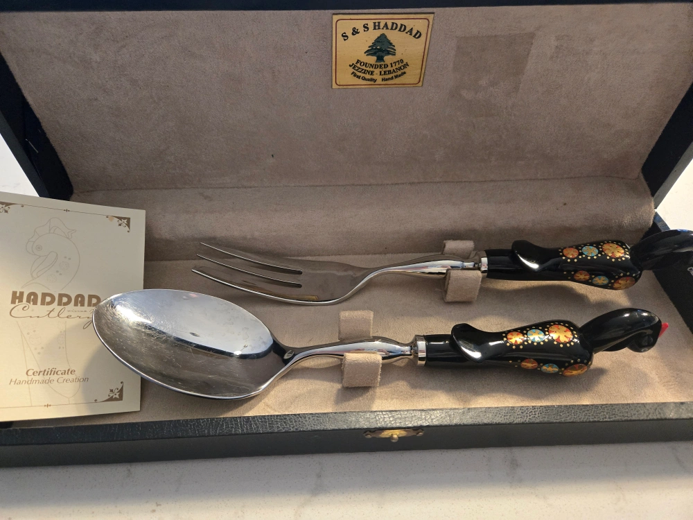Selling a beautiful Haddad Cutlery set, including a spoon and fork. The handles are black with a unique, colourful design. Comes in its original box with a certificate of handmade creation. A lovely addition to any table setting!
