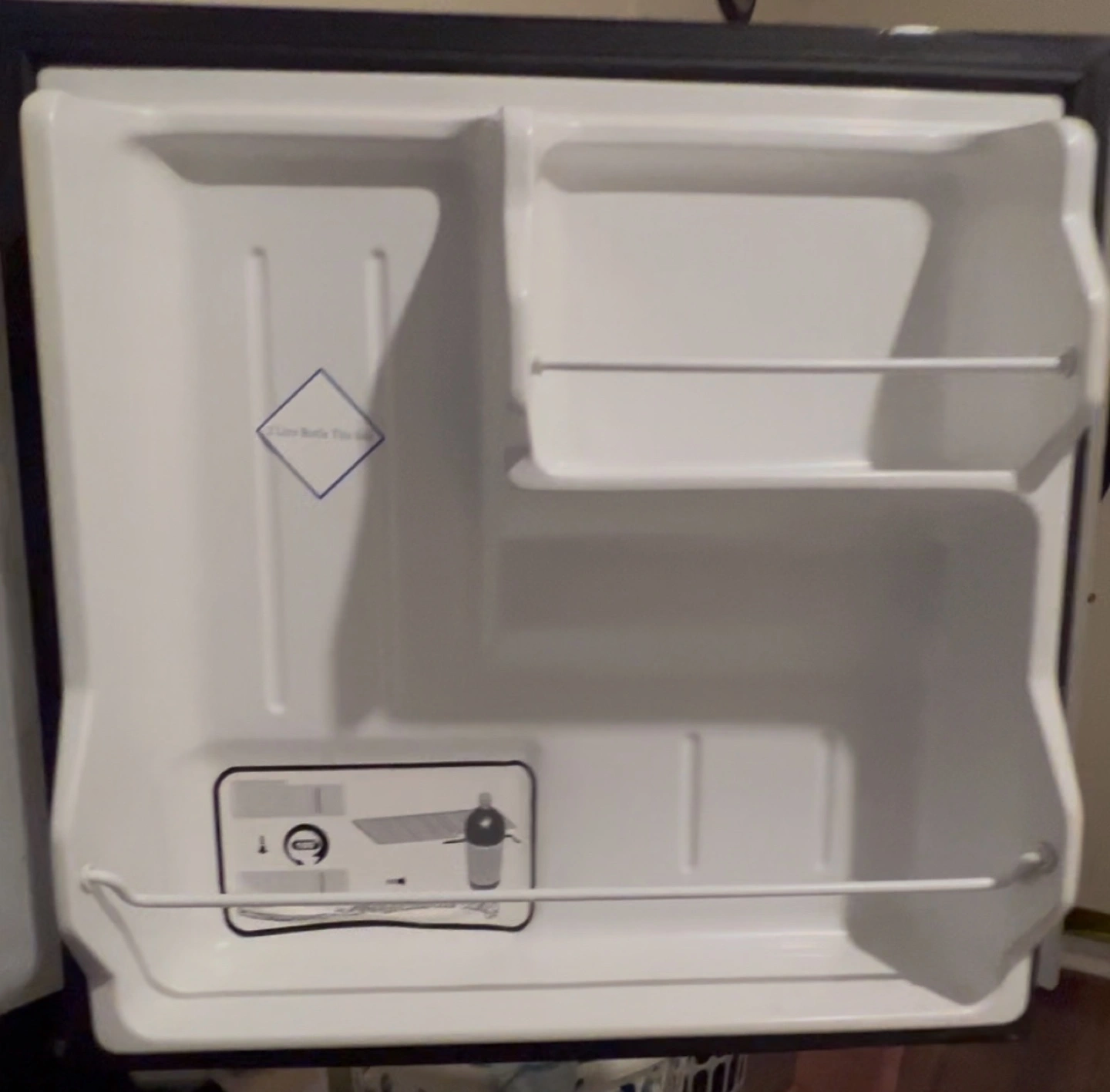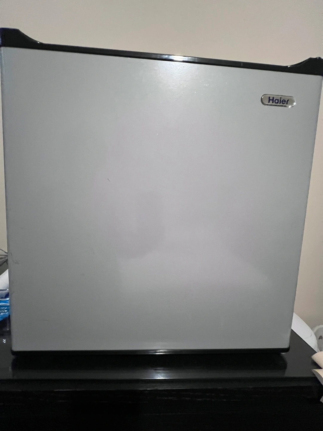 Small, silver mini fridge. Perfect for a dorm room or office. Features shelves and door storage. Used but in good condition, its working and can make ice. selling as is Pick up only: lakeshore and royal york