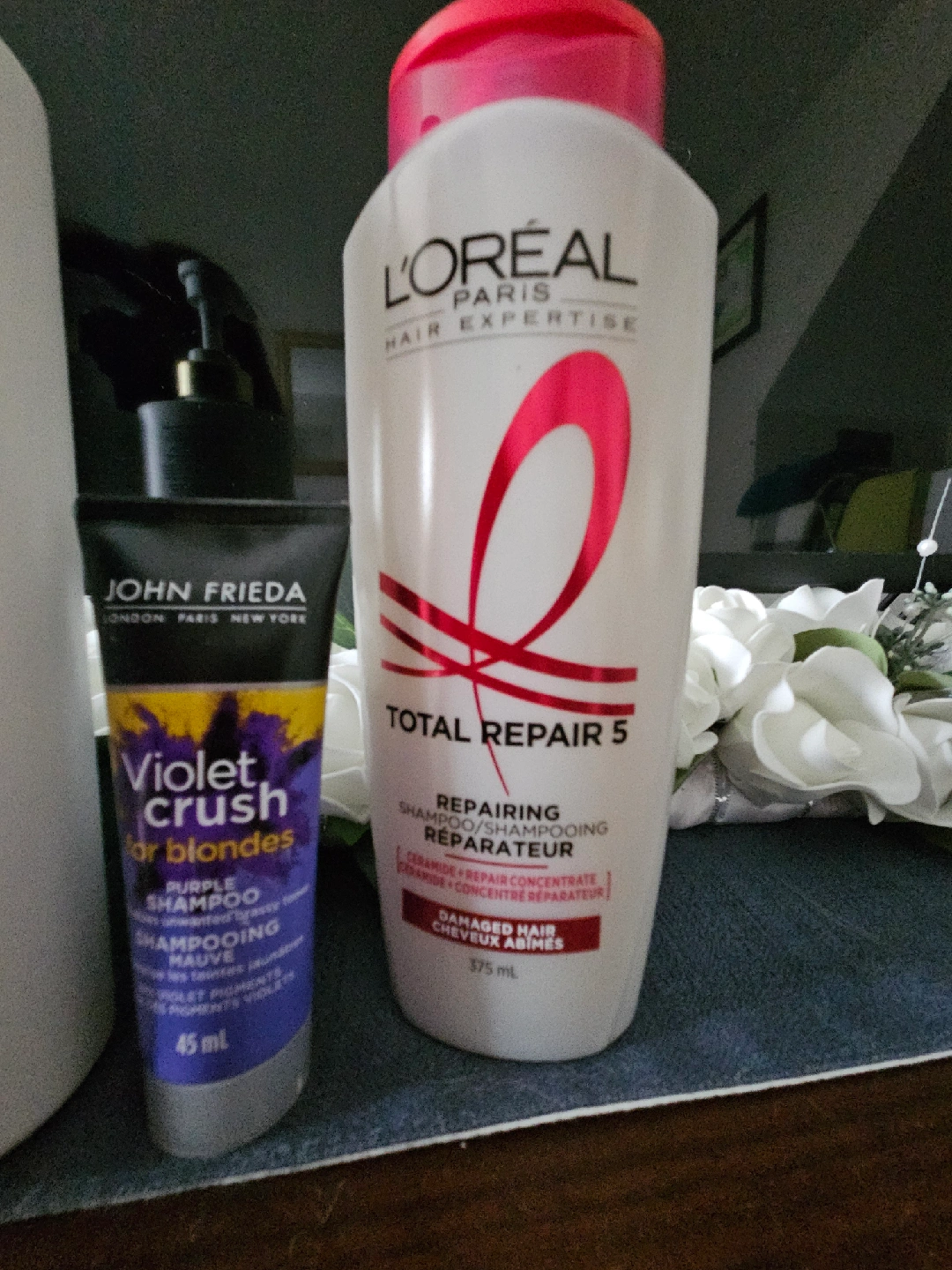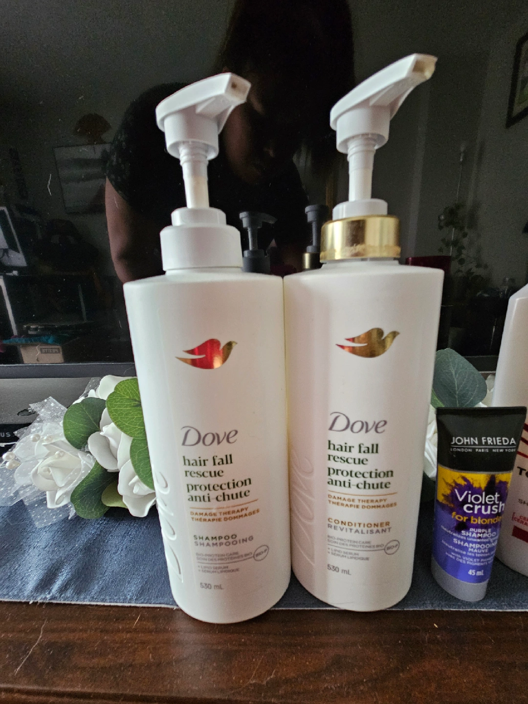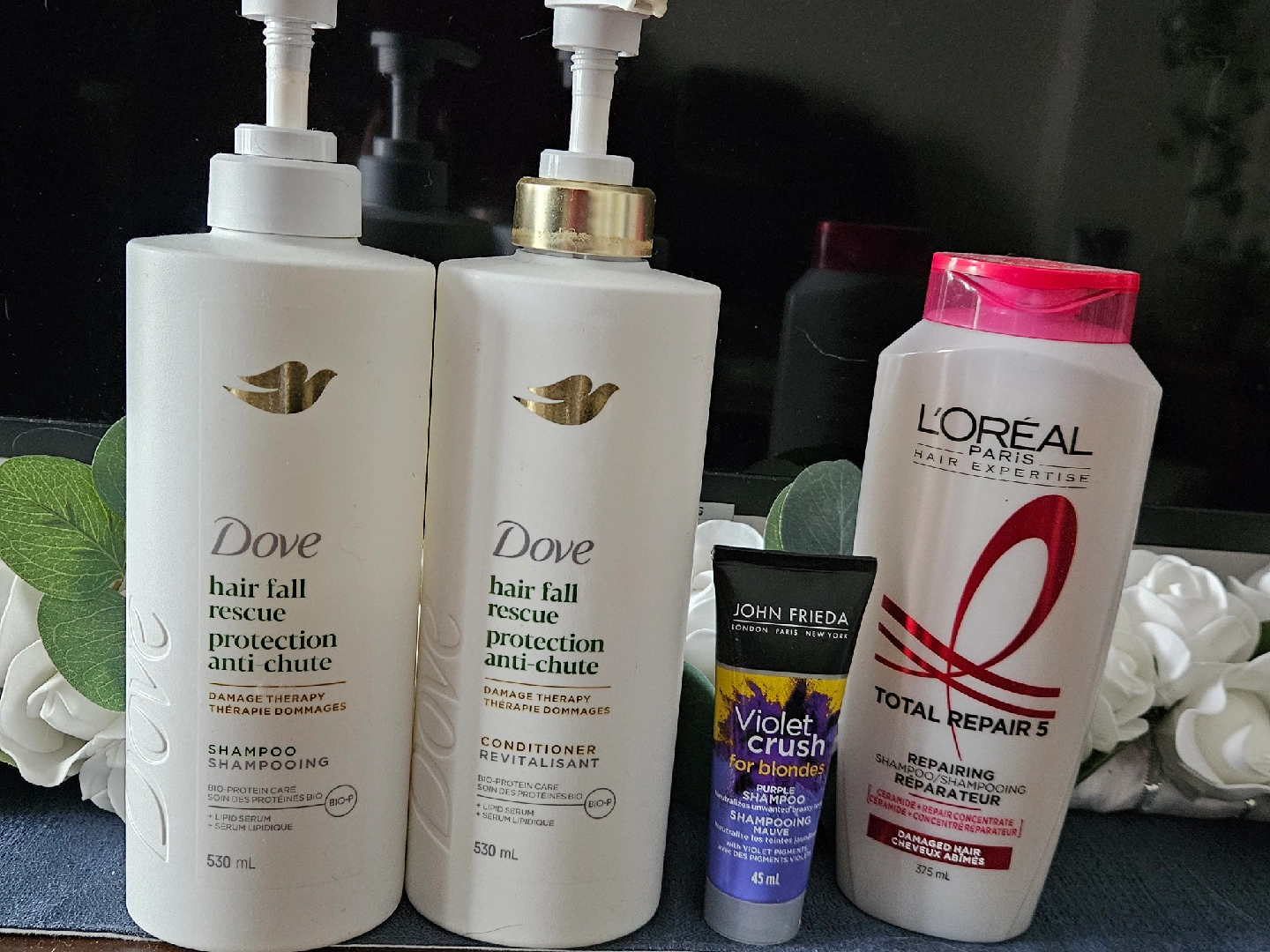 Selling Dove Hair Fall Rescue shampoo and conditioner set. Both bottles are 530 mL, used a few washes. Also includes a John Frieda Violet Crush for blondes purple shampoo (45 mL) and L'Oreal Total Repair 5 shampoo (375 mL) both the smaller products have not been opened or used. selling all together $20 Obo