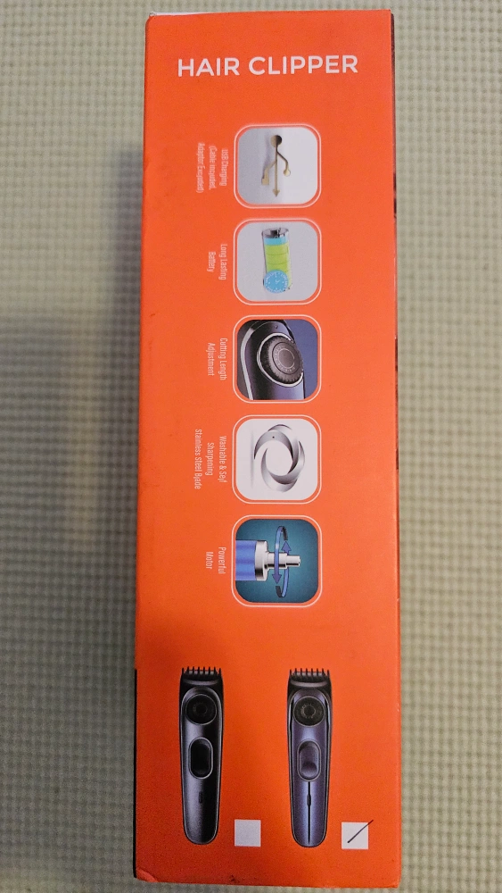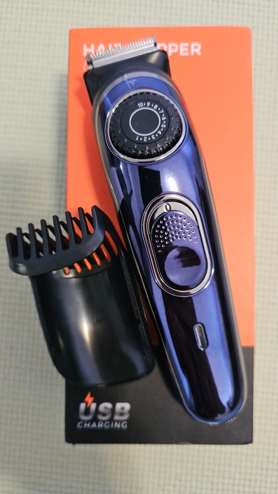 Selling a hair clipper model MU-T-1007. It features USB charging and a knob for comb length adjustment. It also has an efficient acute angle blade.