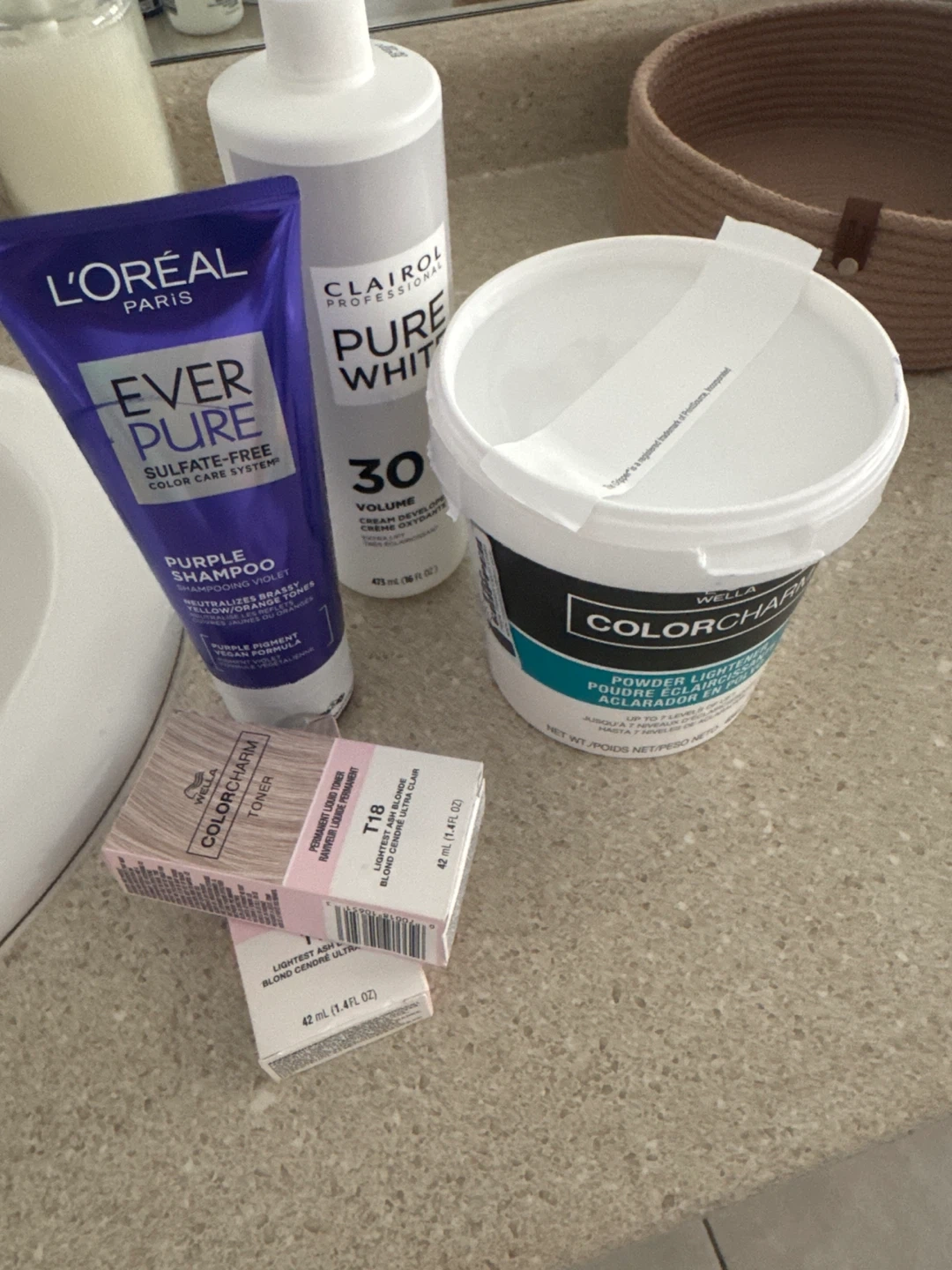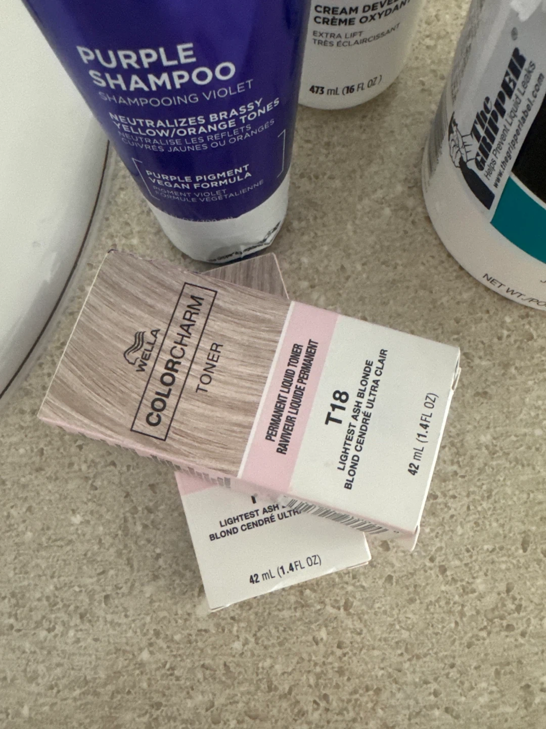 Selling a lot of hair dye products including: - L'Oreal Ever Pure Purple Shampoo - Wella Color Charm Toner T18 Lightest Ash Blonde - Clairol Professional Pure White 30 Volume Cream Developer - Wella Color Charm Powder Lightener