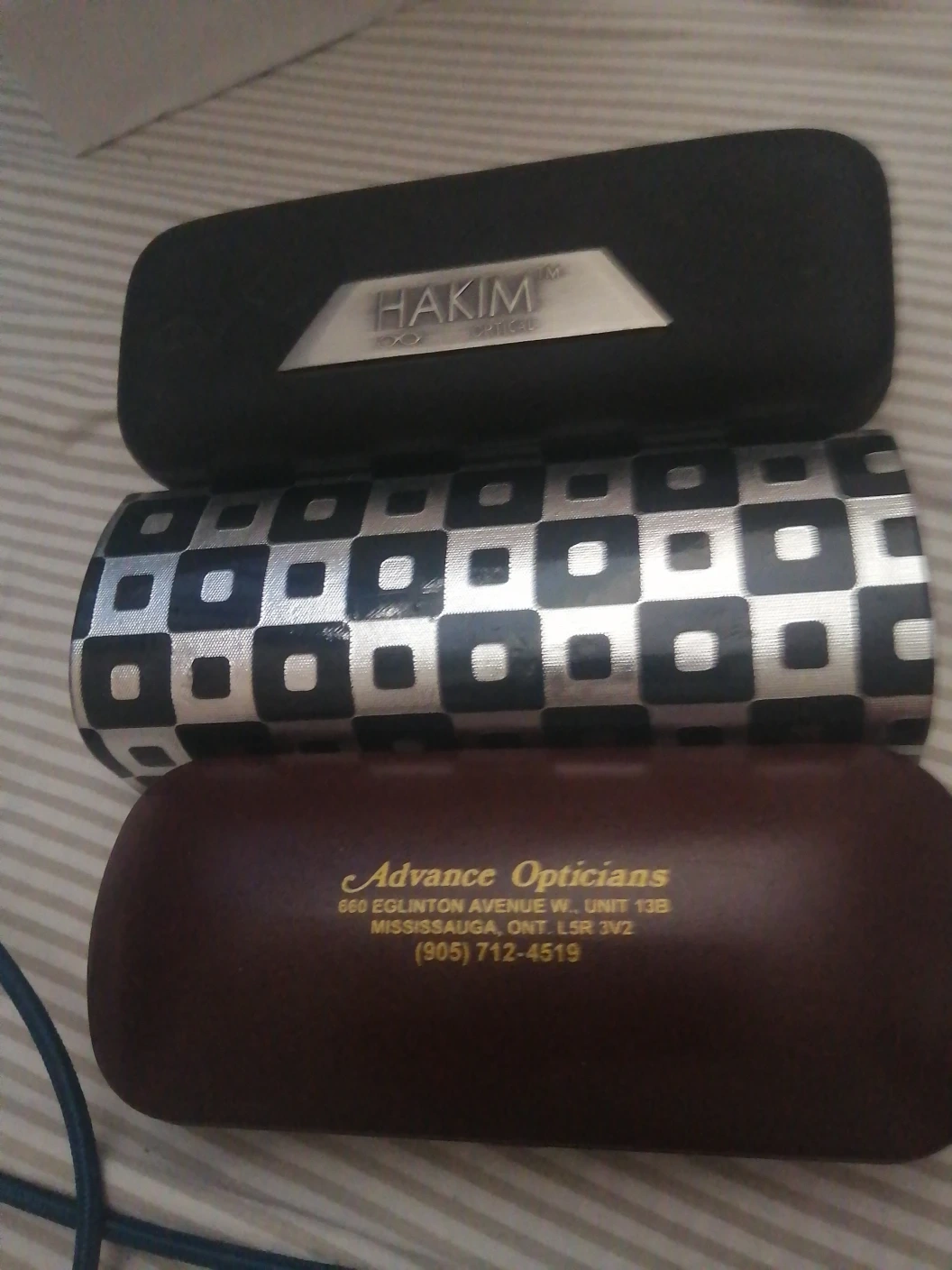 Selling three eyeglass cases. One is from Hakim Optical, one has a checkered pattern(Hakim Optical), and the other is from Advance Opticians. Great for protecting your glasses!