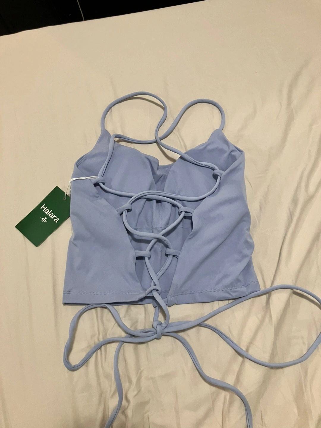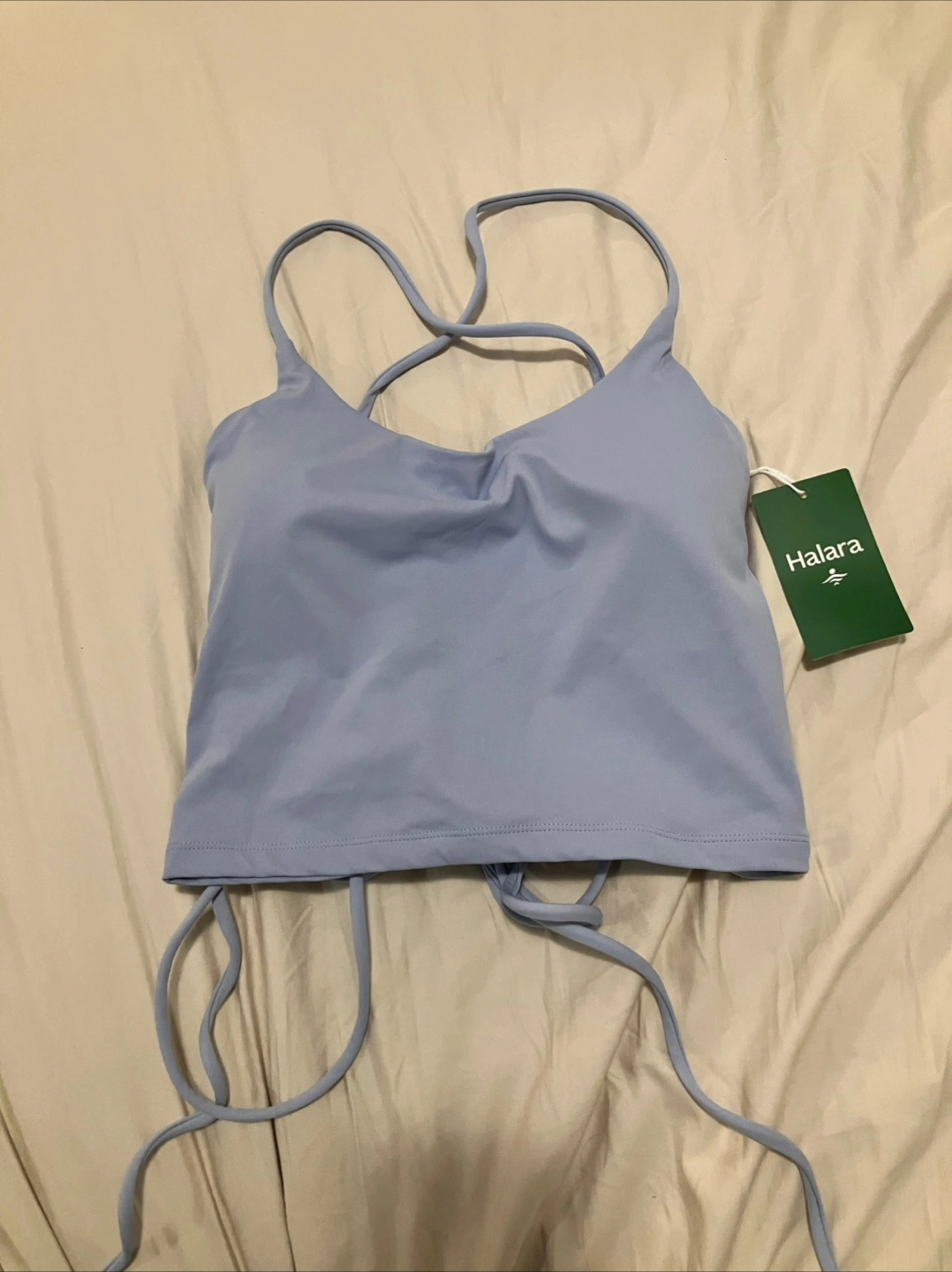 Pretty periwinkle blue shirt. Never worn. Would be nice during yoga or as a cute summer top. Stretchy material. Size M. Paid $54 for it.