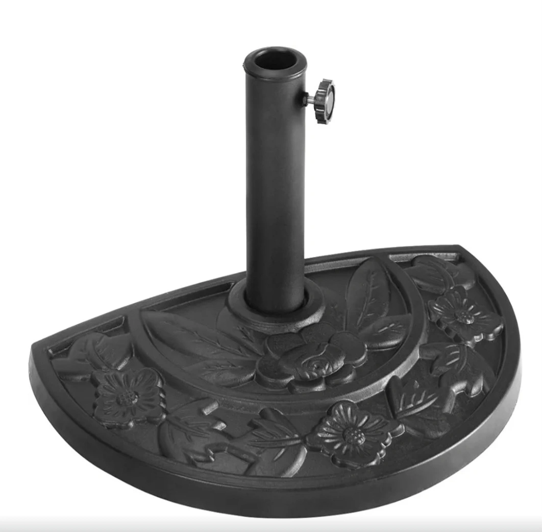 Selling a half patio umbrella and its base. It's perfect for small balconies or patios where space is limited. The umbrella is a red colour, and the base is black with a floral design. Great for adding some shade to your outdoor space!