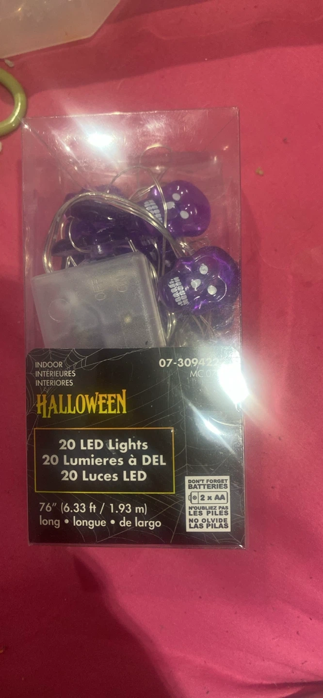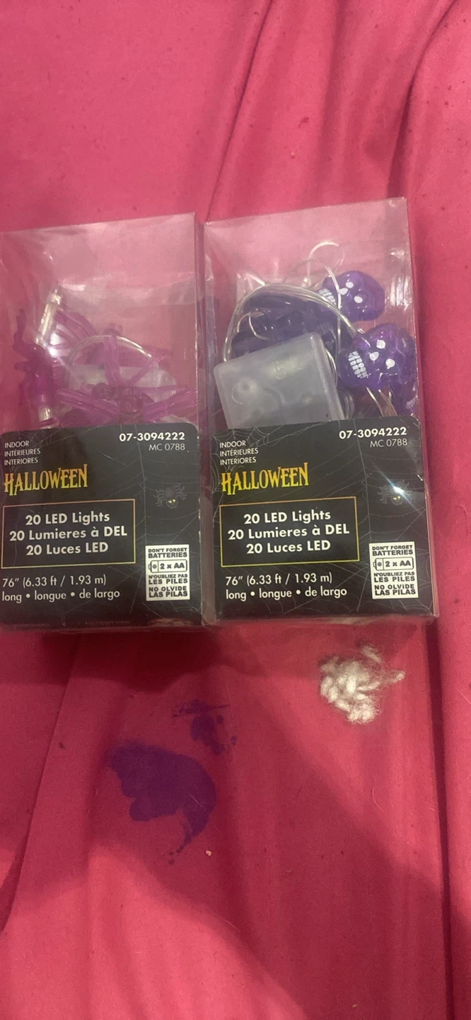 I'm selling Halloween themed indoor string lights. They are 76 inches (6.33 ft / 1.93 m) long. They require 2 AA batteries.