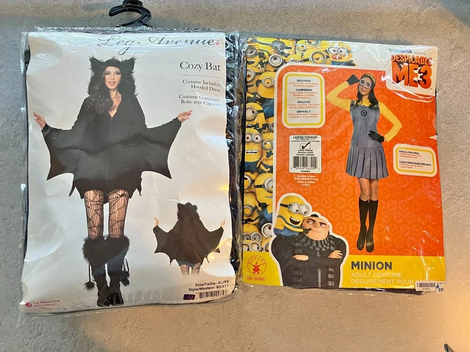 $40 each. $70 for both. Both are in perfect condition since they were only worn once. Cozy bat includes the hoodie shown in the photos. Size XL. Minion costume includes the dress, eye goggles, black gloves, and a yellow headband. Size L. Cash only. Pickup in Kerrisdale or Van City Centre station.