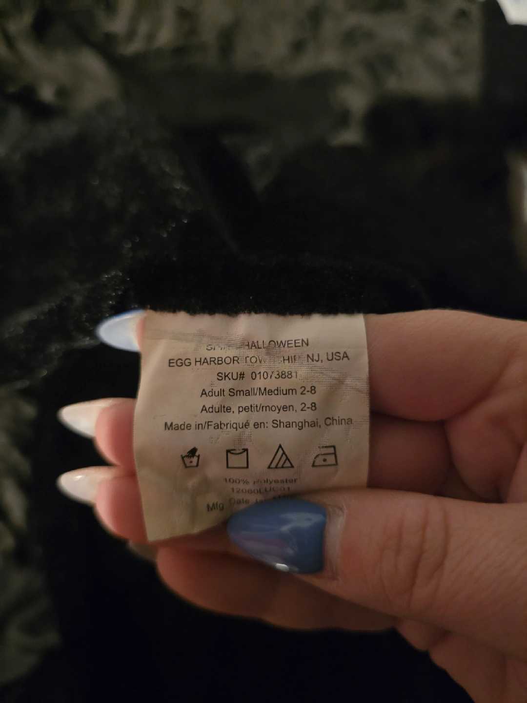 Selling a Halloween costume. It's adult size small/medium (2-8). The costume is made of 100% polyester come with a hat. (may need to be stuffed at the top as its been in storage for years.)