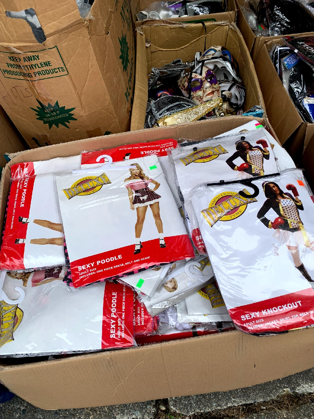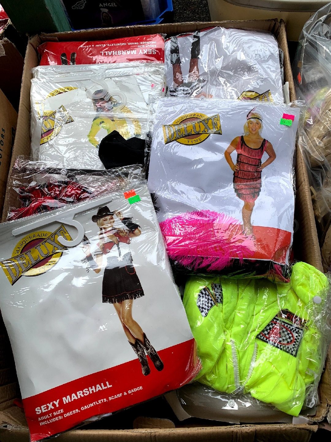 I have a selection of Masquerade Deluxe Tyme adult costumes available. They are all in their original packaging and include all accessories as shown on the packaging. Adult size also have boxes of new wigs masquerade masks gloves men's and women's Halloween costumes