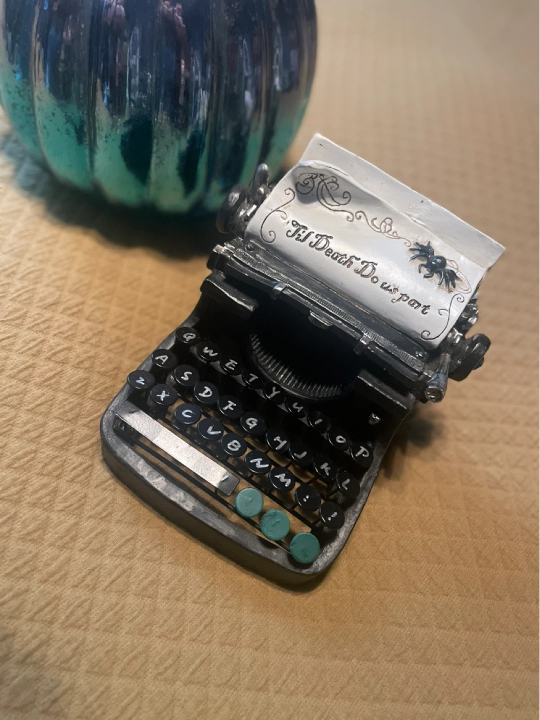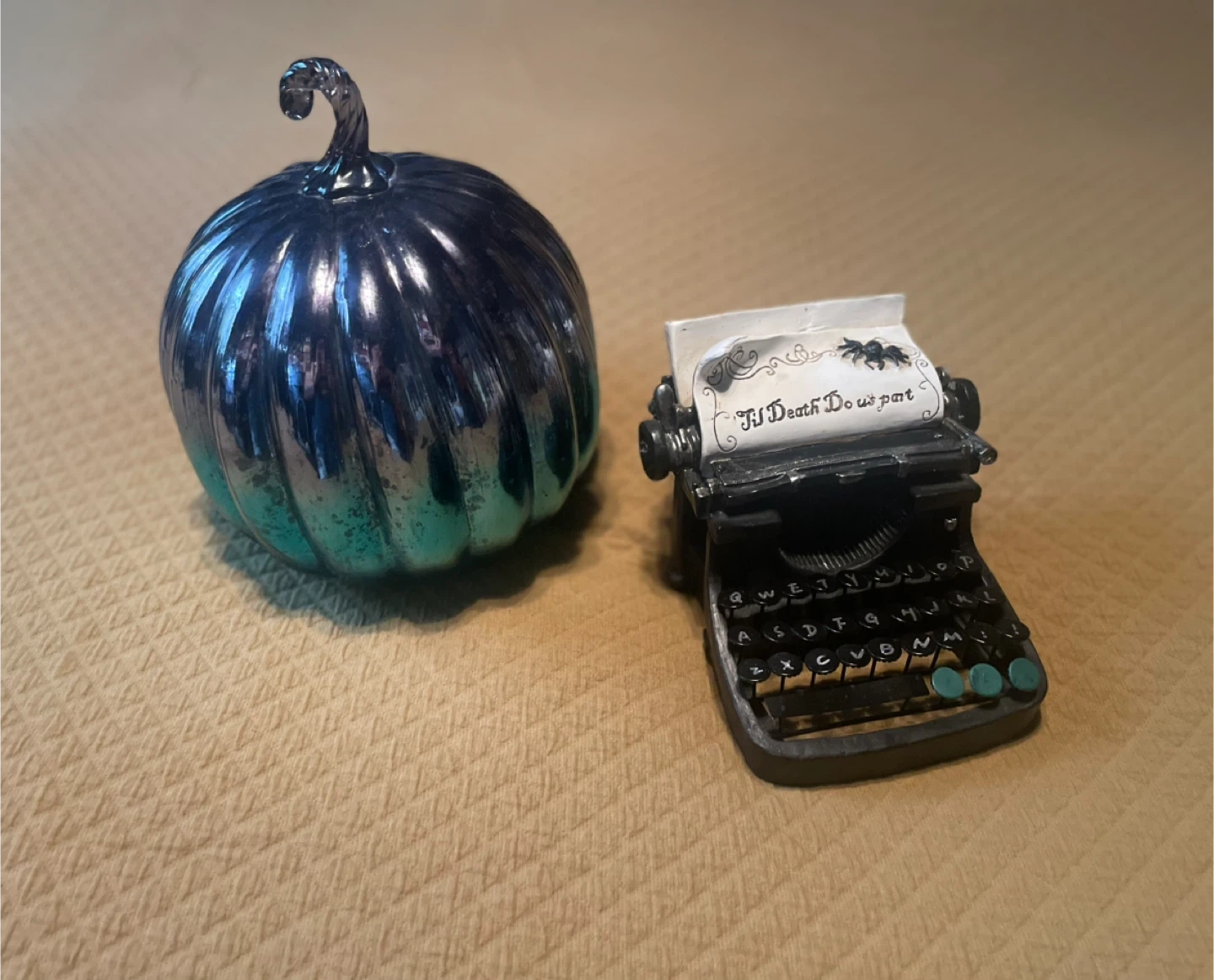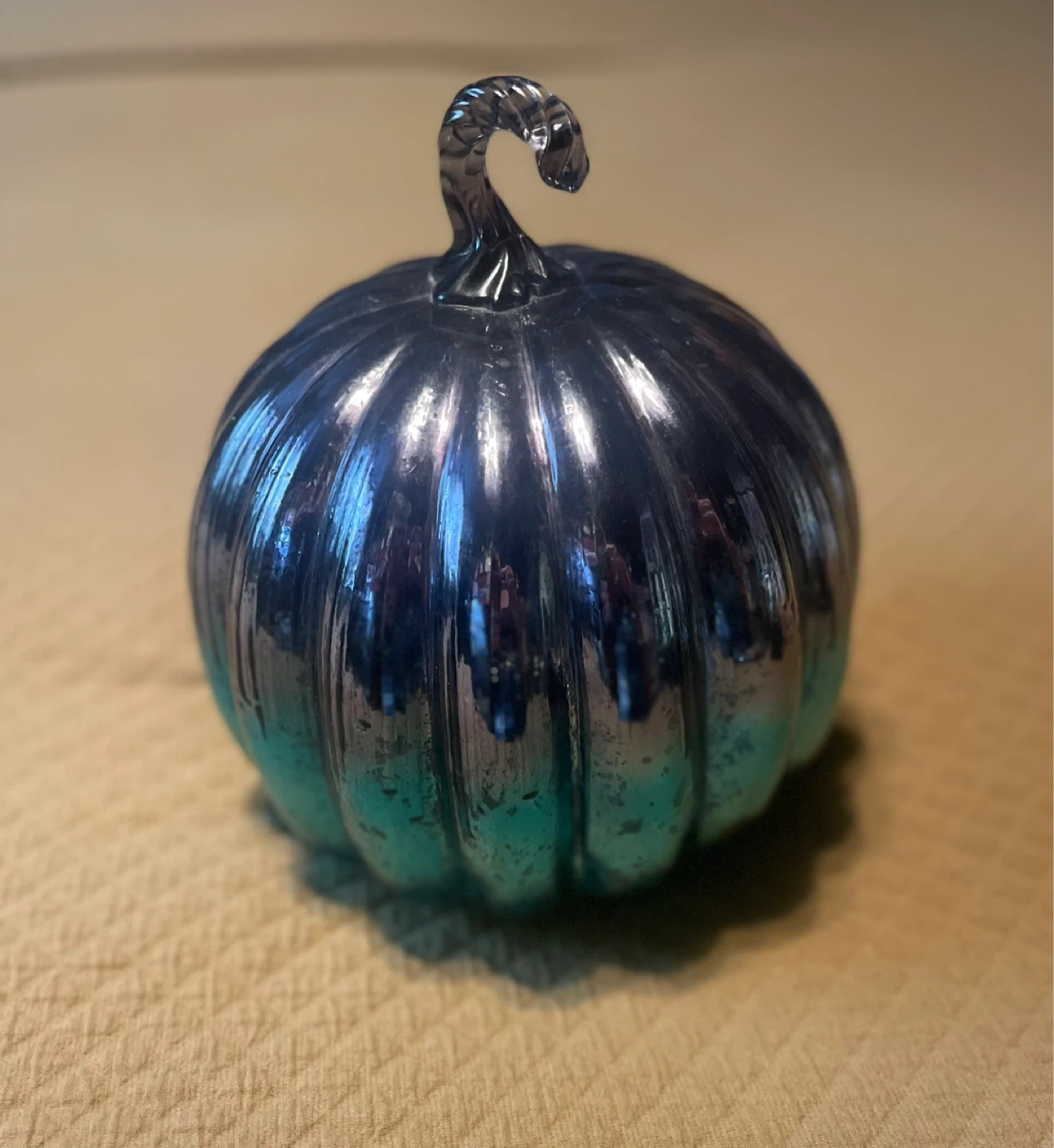 Beautiful glass ombré pumpkin is about 10 inches in height — black, silver and turquoise colour scheme and is absolutely stunning in person. Also included is a vintage-style typewriter made from a mix of ceramic, resin and metal — typewriter alone was purchased for $20. Both were purchased for a display, but I went with something else so these went unused. Pick up from a smoke free home near Browns Line & Lakeshore Boulevard in Etobicoke (Toronto/Mississauga).