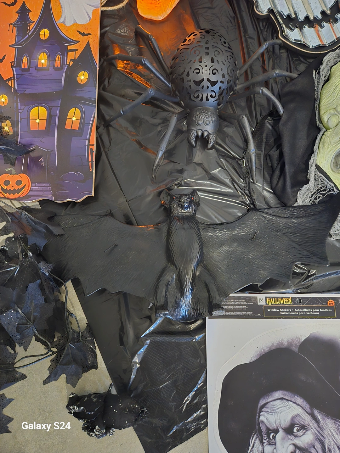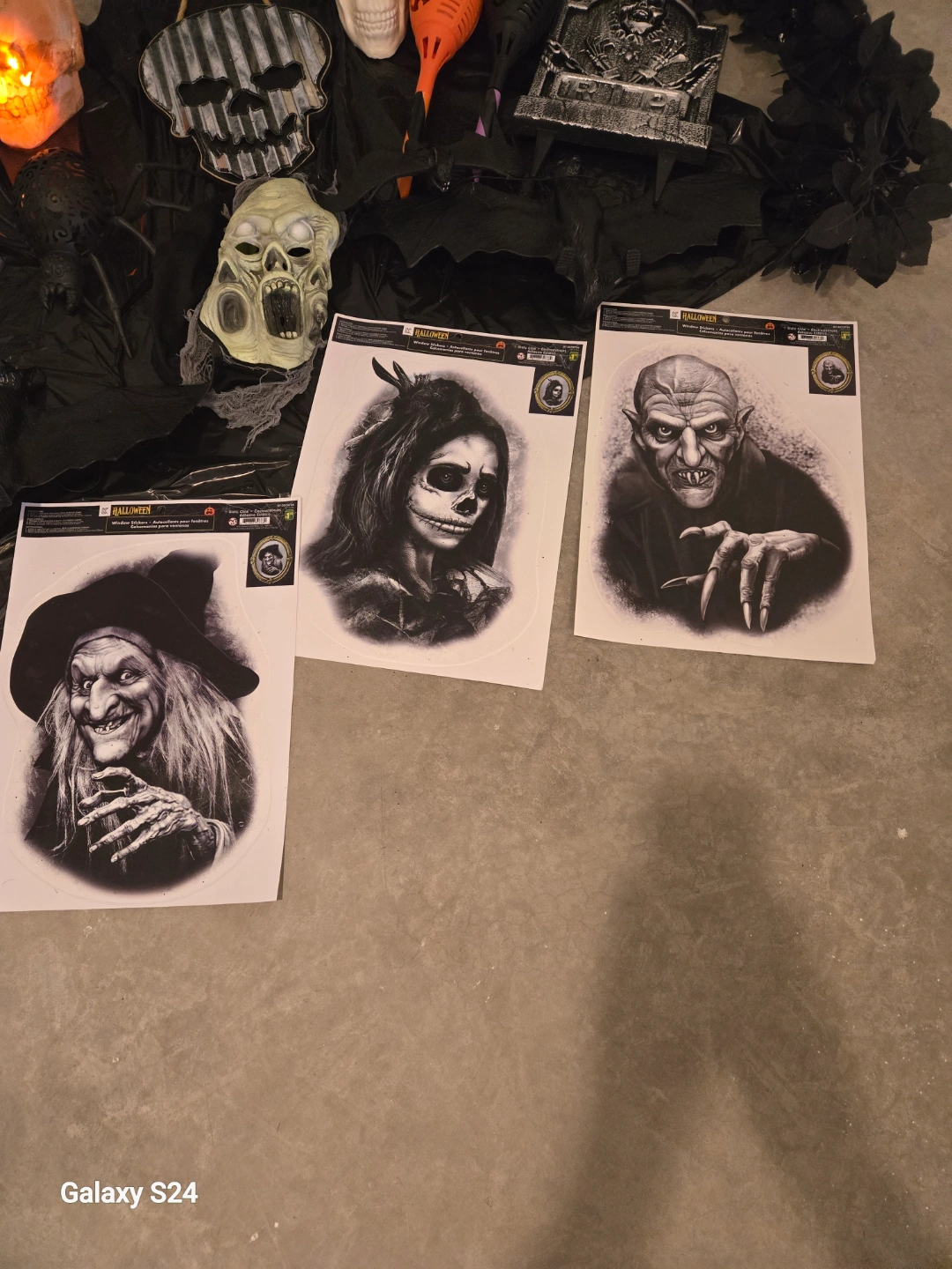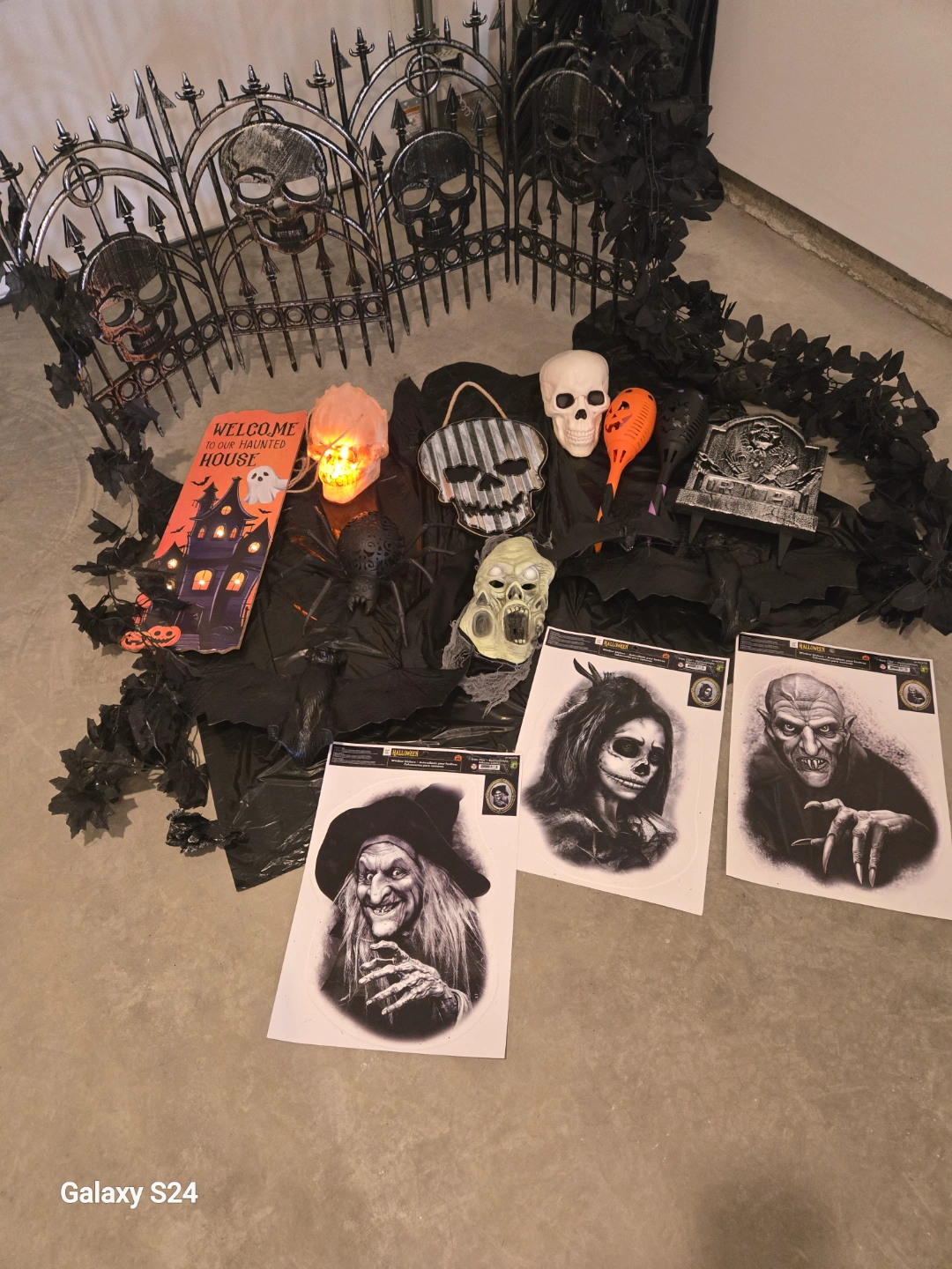 Spooky Halloween decorations. Includes skull fence, light-up skull, various masks, Halloween sign, and window clings. Perfect for creating a haunted atmosphere. Excellent condition used once.