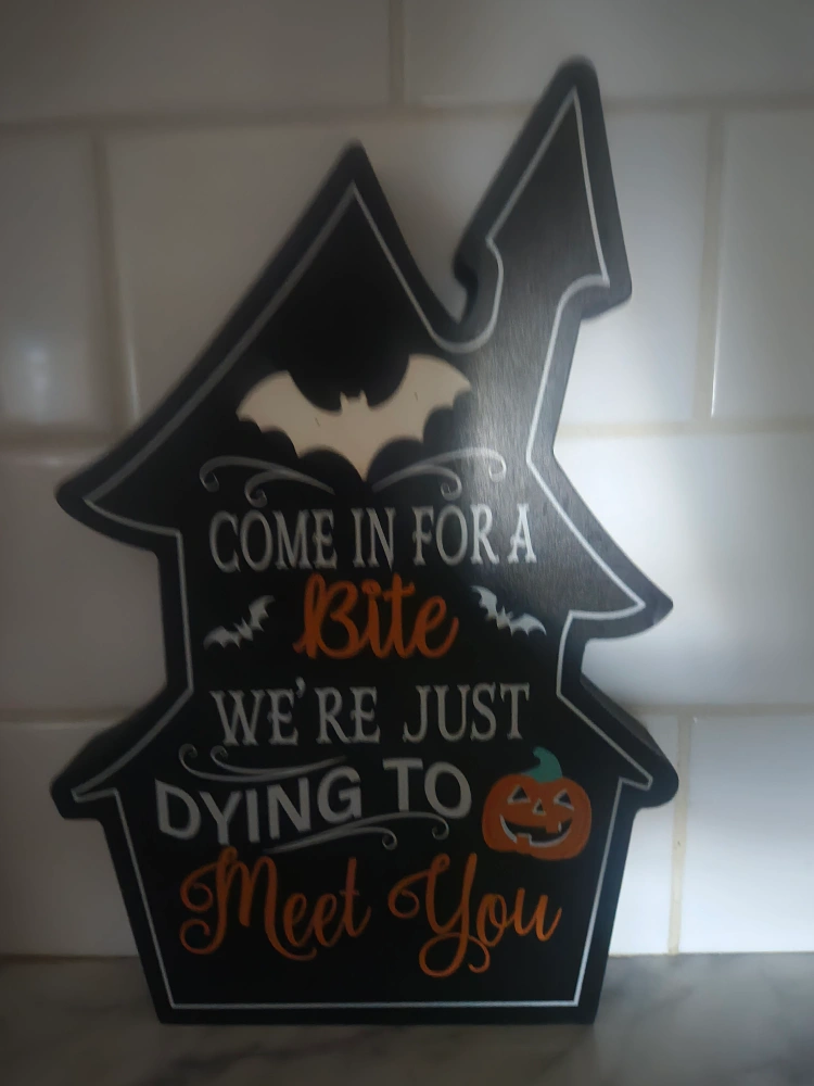 A cute Halloween sign to add some spooky vibes to your home! The sign is shaped like a haunted house and features a bat, pumpkin, and fun Halloween-themed text