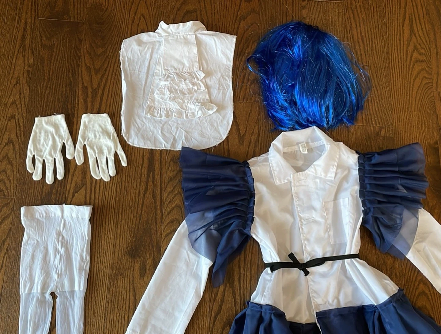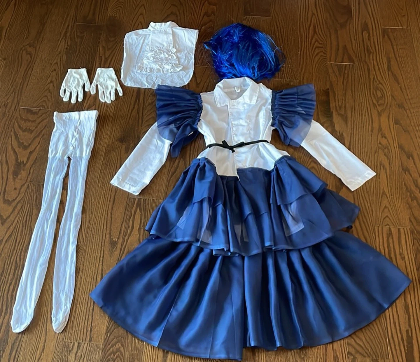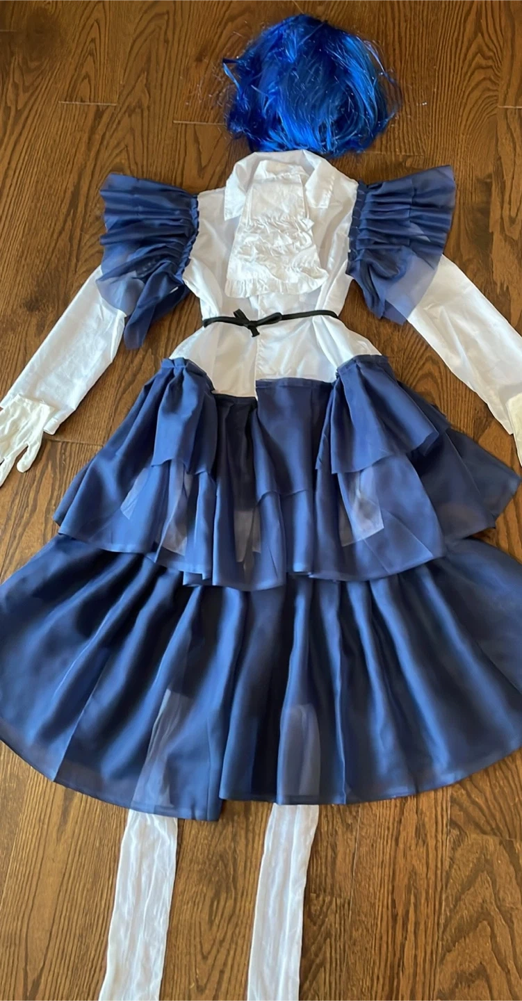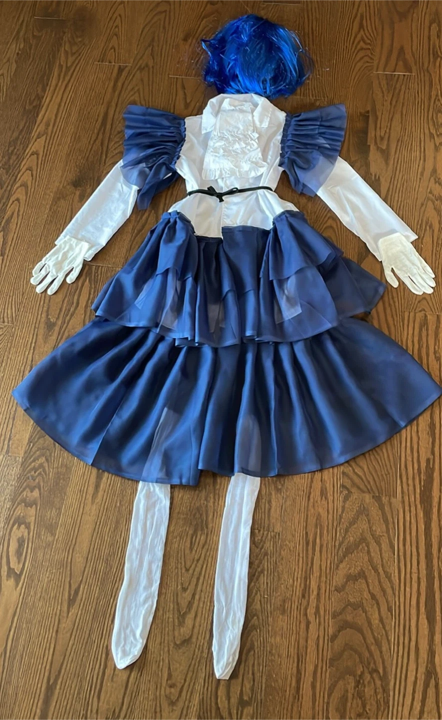Selling a complete Halloween costume! This set includes a vibrant blue wig, a detailed dress with layered ruffles, a pair of white gloves, white tights, and white neck decorations. Pick up in Burlington