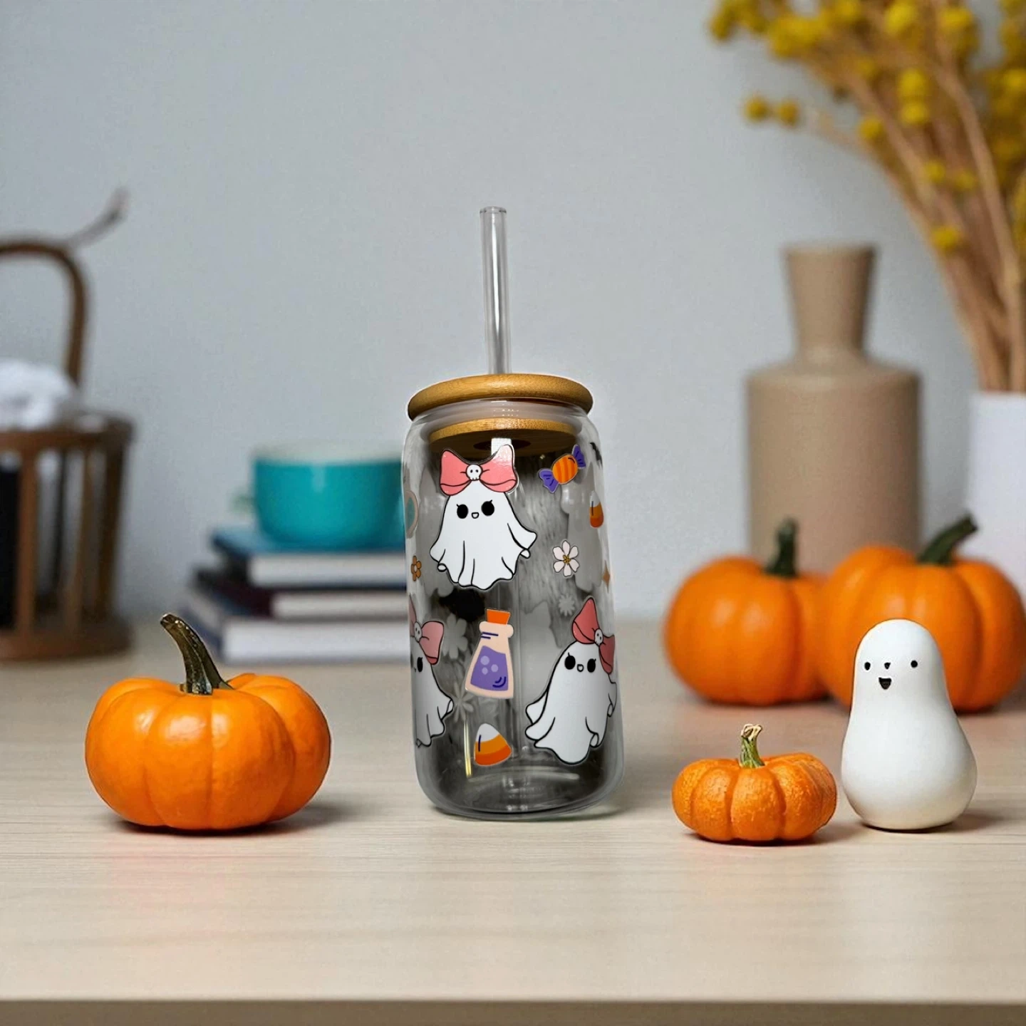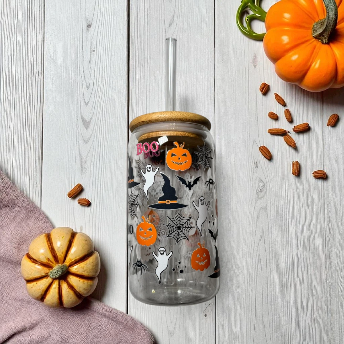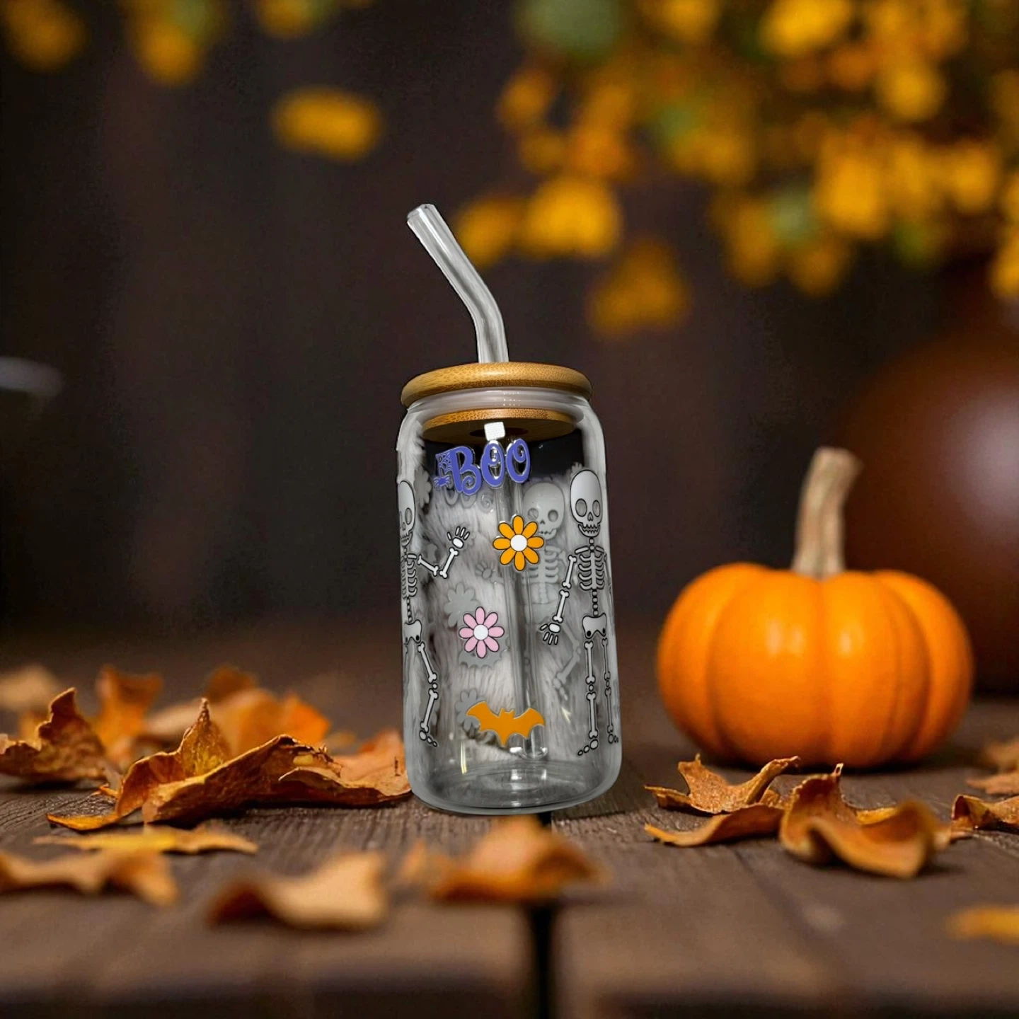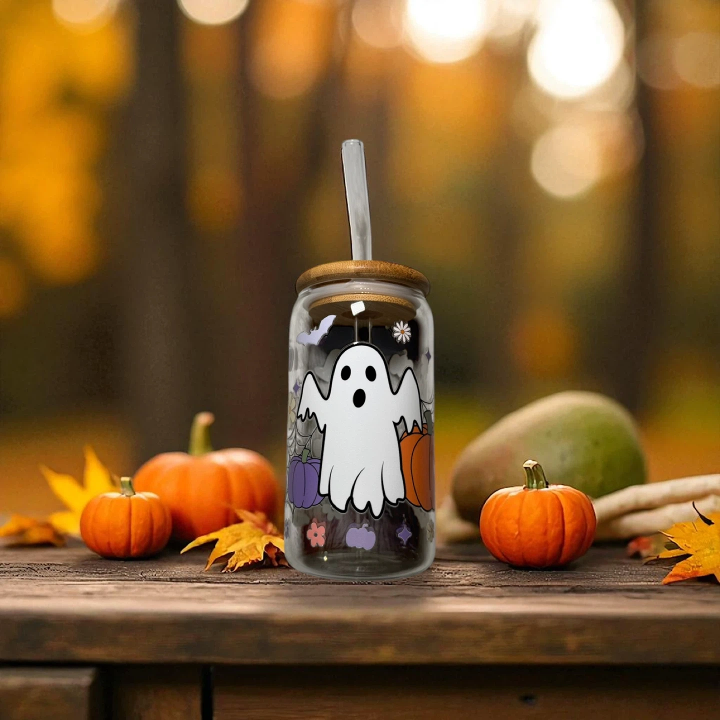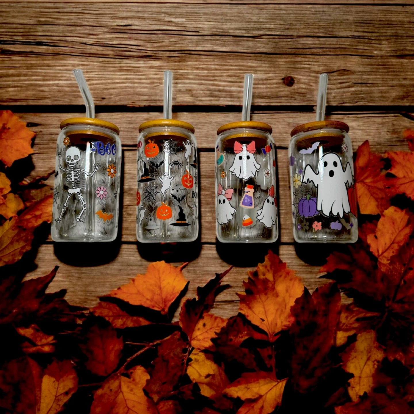 Halloween Glass Tumblers – 16 oz 🎃 Sip in seasonal style! These high-quality glass can cups come with bamboo lids and reusable straws—perfect for iced coffee, tea, or your favorite fall drink. 💛 Details: • 16 oz glass can with bamboo lid & clear reusable straw • High-quality UVDTF transfers • Hand-wash only for longest life • Perfect for gifts, parties, or treating yourself! 🍁 Pick your favorite design and bring a little autumn magic to every sip.