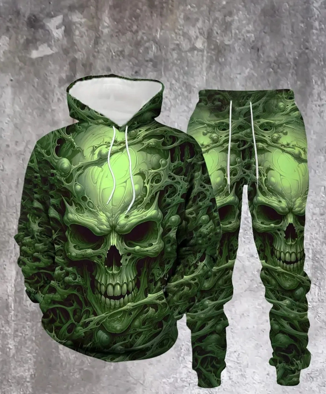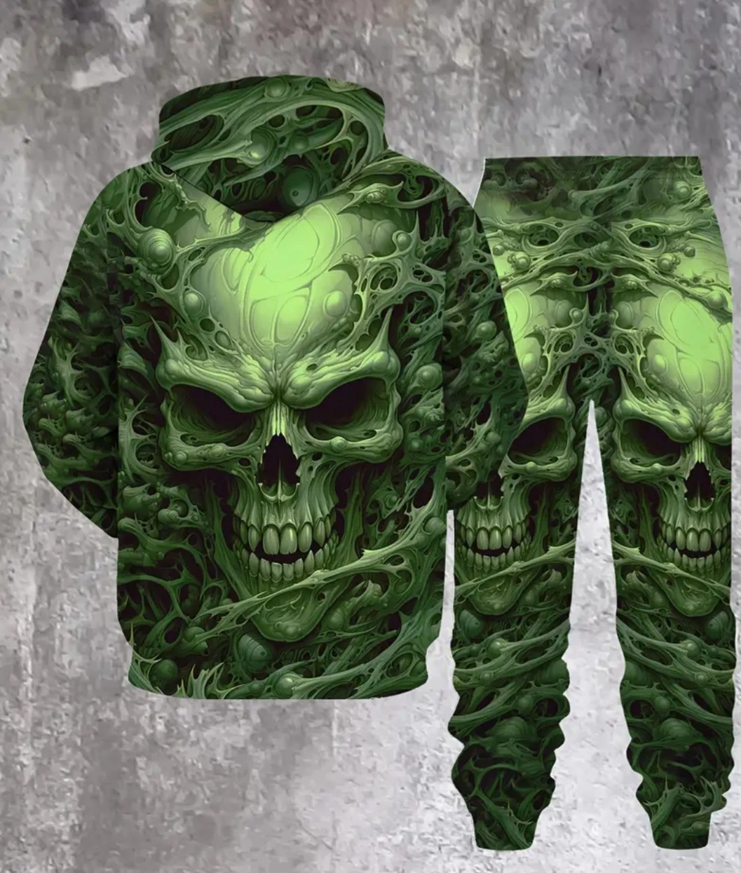 Selling a green skull hoodie and pants set. New, never worn. Poly blend.