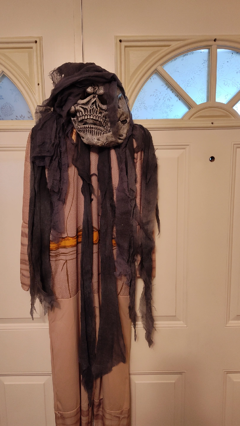 Get ready for Halloween with this mummy costume! It comes with the mask and the full body suit. Perfect for spooky season! Size is kids large which is appropriately size 12-14 pick up in Lisgar area of Mississauga