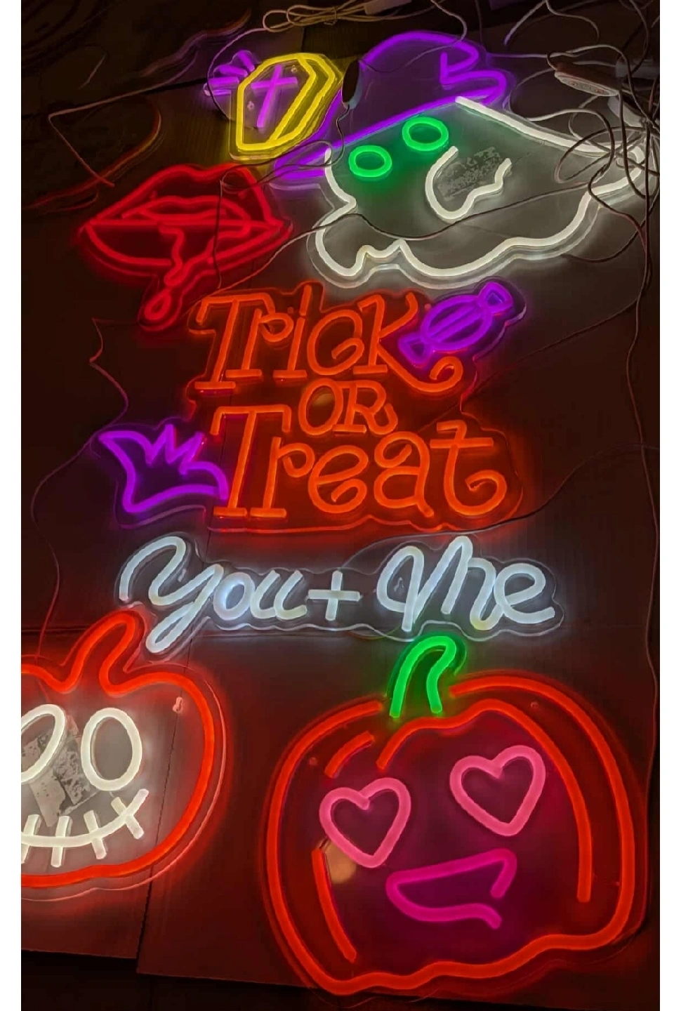 Get ready for spooky season with these fun neon signs! Perfect for adding a festive touch to your Halloween decorations. Includes a variety of designs like 'Trick or Treat,' pumpkins, and more!