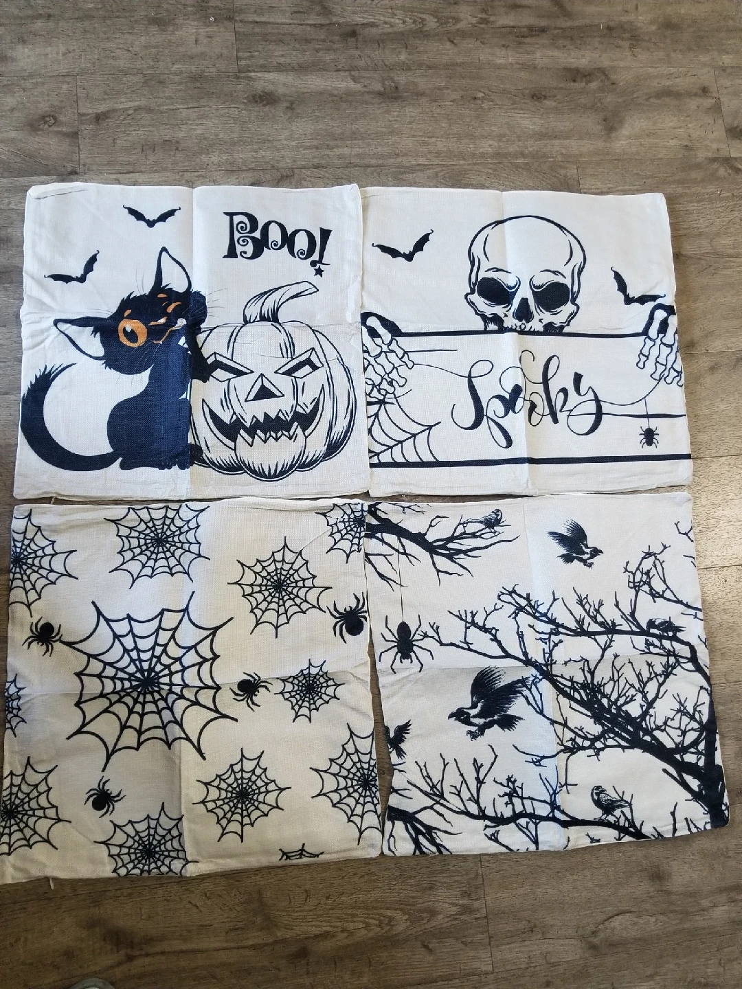 Get ready for spooky season with these adorable Halloween pillow covers! This set includes four covers, each with a different design: a black cat and pumpkin with 'Boo!', a skull with 'Spooky', spiderwebs, and a spooky tree with birds. Perfect for adding a festive touch to your home. Brand new 17x17