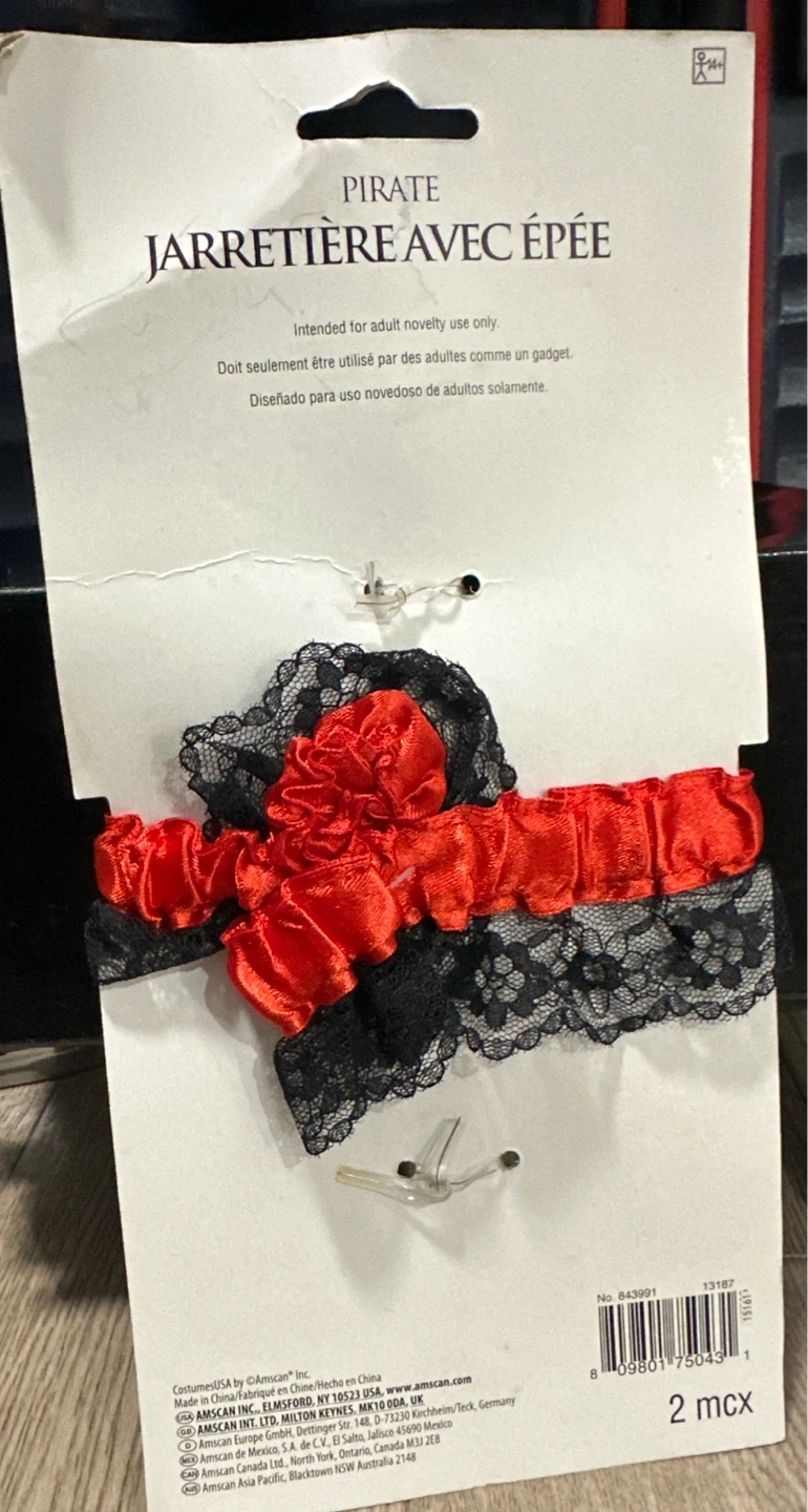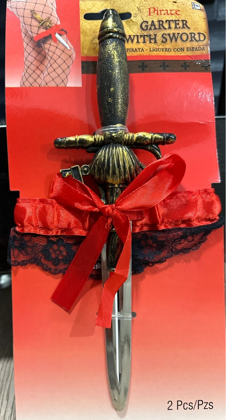 This is a pirate garter with a sword costume accessory. Includes a red and black lace garter with a small decorative sword.