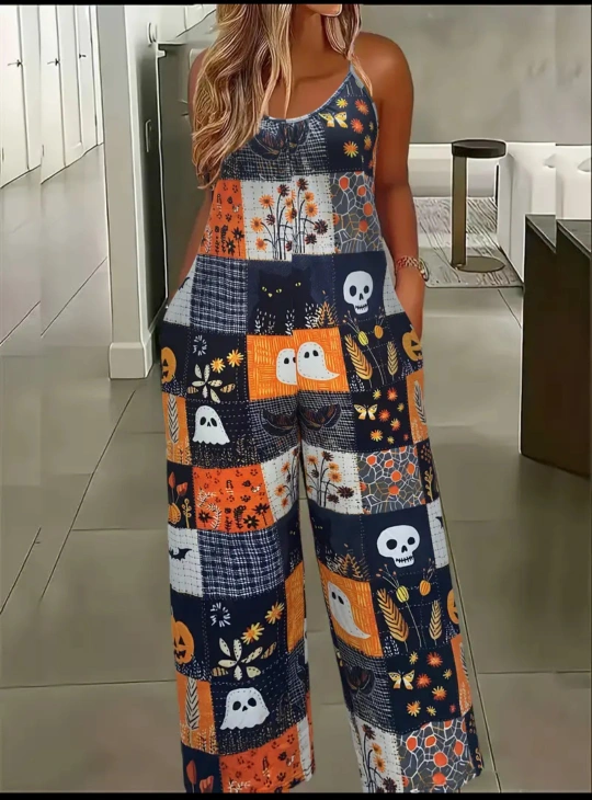 This spooky and stylish jumpsuit features a fun Halloween print with patchwork designs. Perfect for adding a festive touch to your wardrobe!