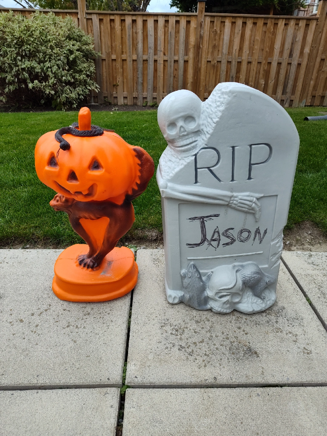 Halloween decorations, pumpkin and tombstone. These are very old Union Products blow decorations. $30 each. 2 for $50. Firm price. Pickup location is Markville Mall Tesla charging stations near Hwy7 and McCowan Road