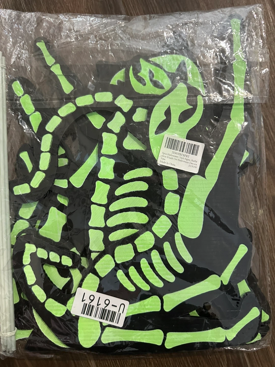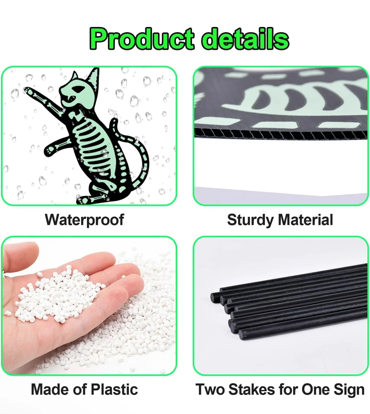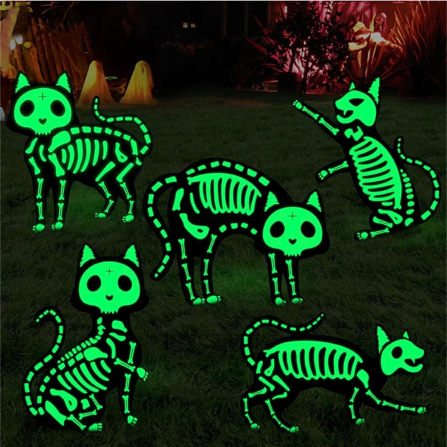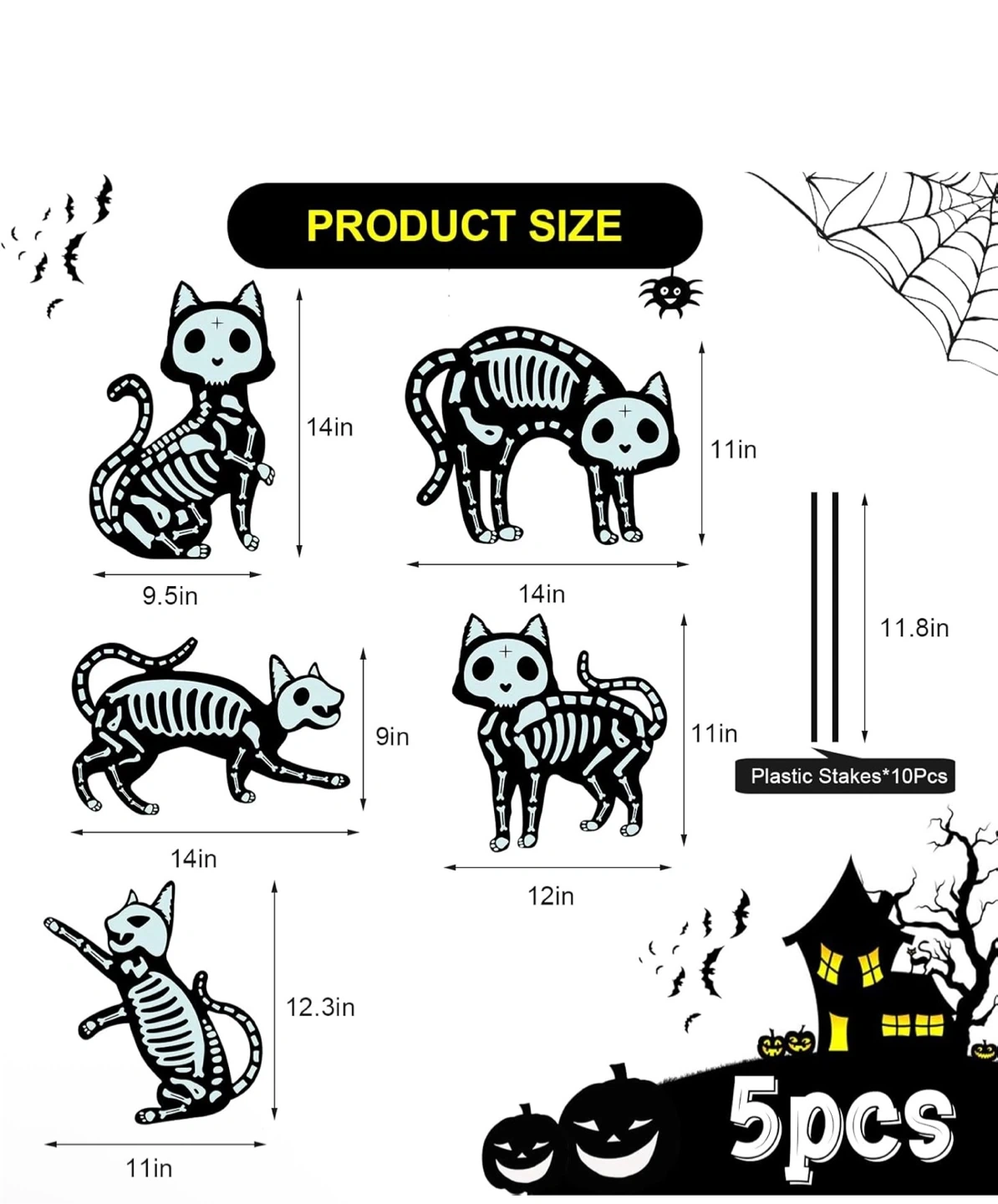 Get ready for Halloween with these fun skeleton cat yard signs! There are 5 different cat designs included, perfect for decorating your lawn. They're made of waterproof and sturdy plastic material, and each sign comes with two stakes. The sizes vary, but they're all around 9-14 inches tall.