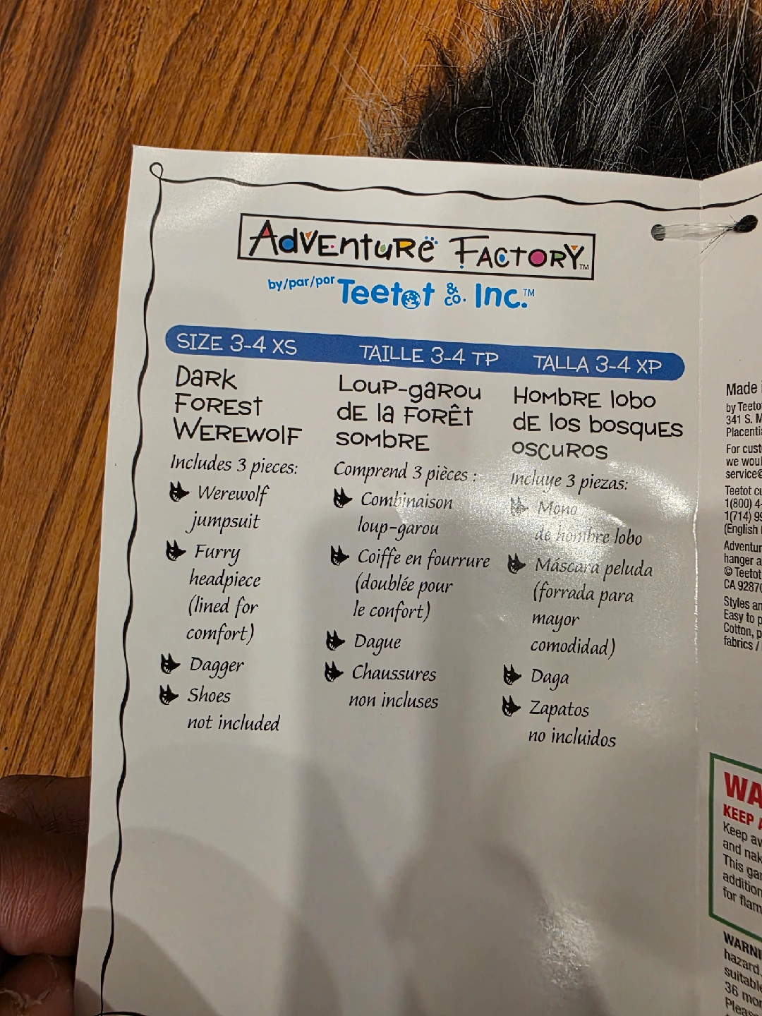 Get your little one ready for Halloween with this adorable Dark Forest Werewolf costume from Adventure Factory! It's a size 3-4 XS and includes a jumpsuit, furry headpiece (lined for comfort), and a dagger. Shoes are not included. Perfect for dress-up or a spooky night out!