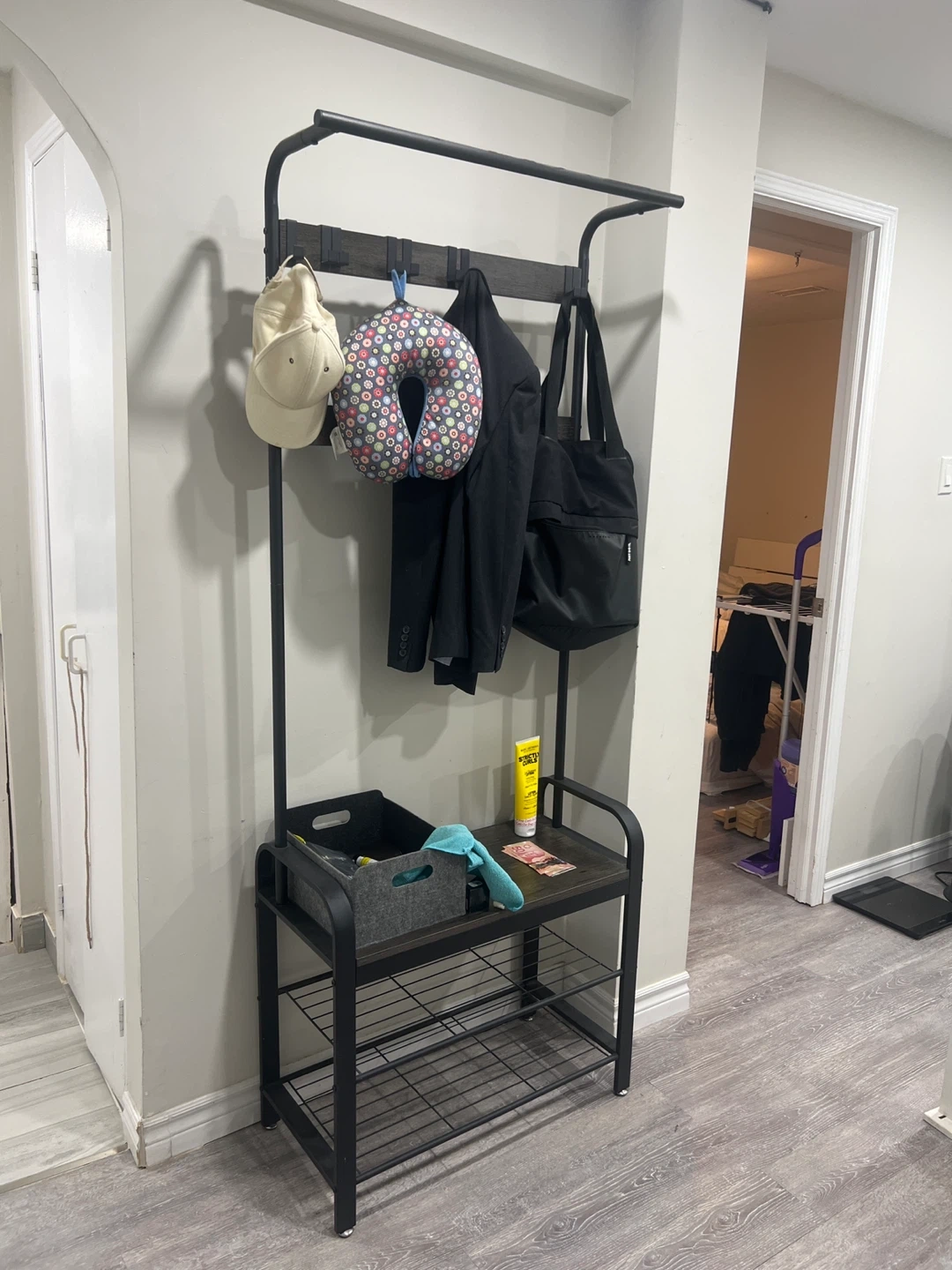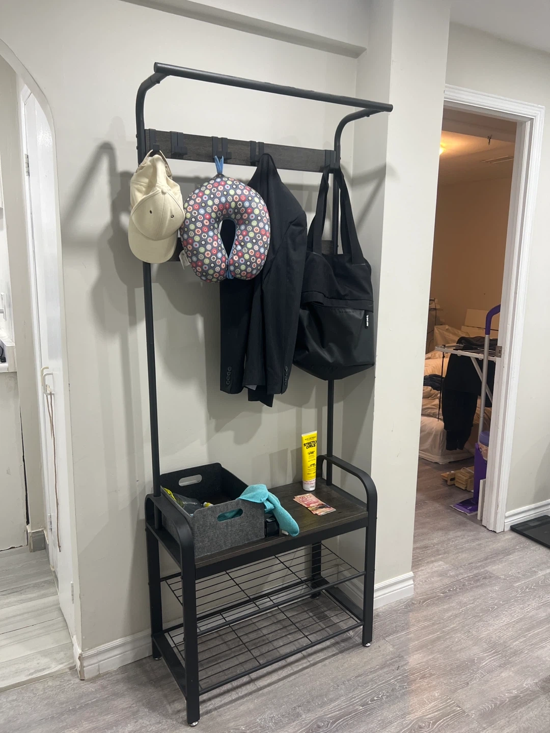 Looking to sell this hallway coat rack with a shoe storage bench. It's a great way to keep your entryway organized! The rack has a sturdy frame and a simple design that fits into any decor. There's also a shelf underneath for storing shoes or other items