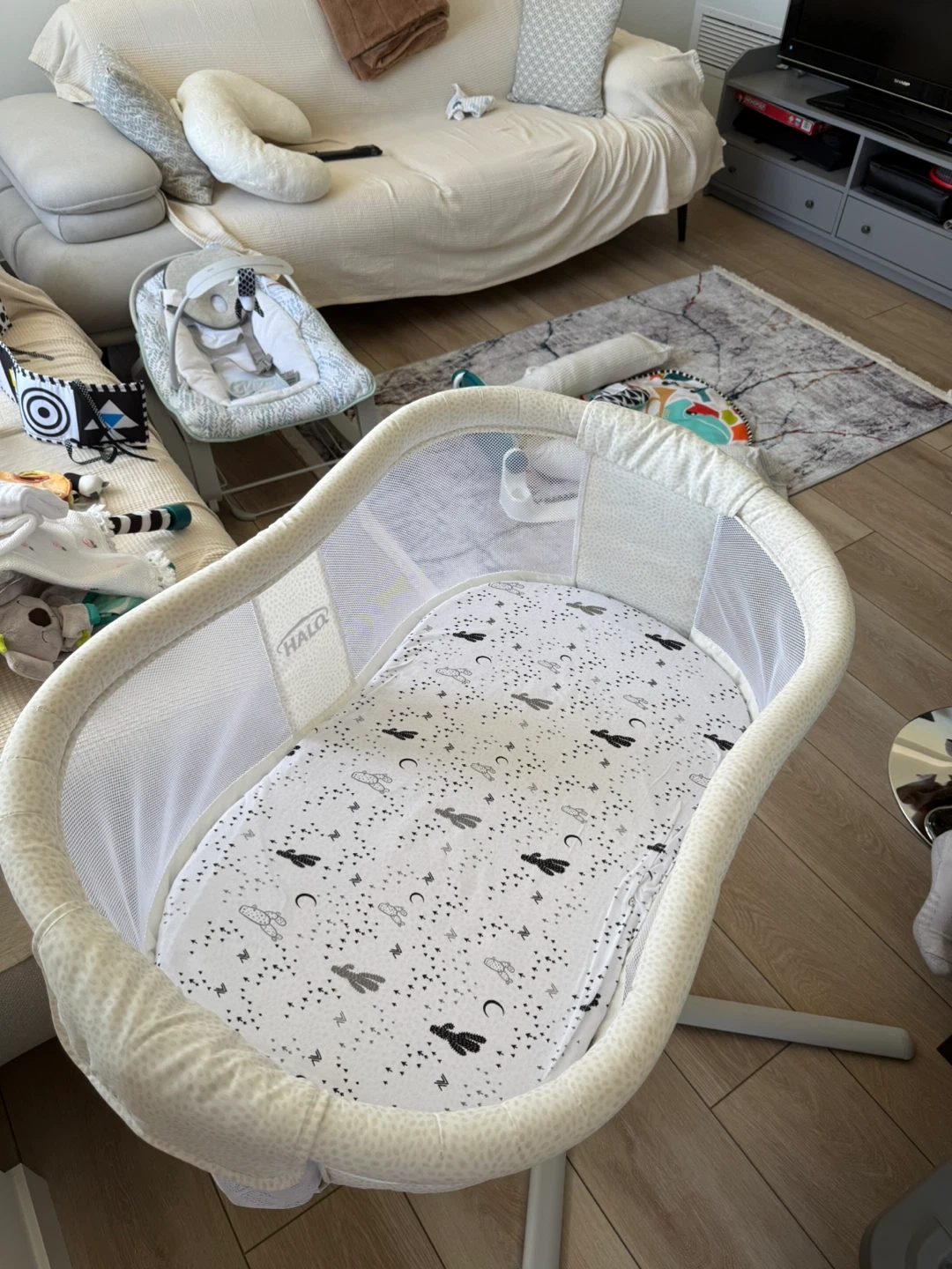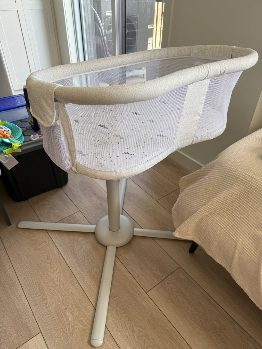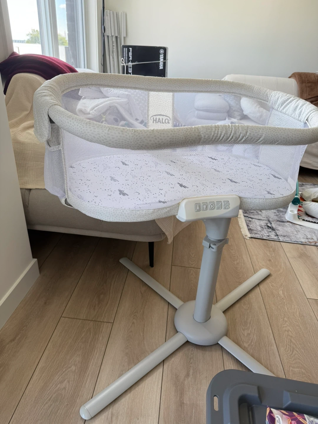 Selling a Halo BassiNest Swivel Sleeper! It's in great condition and perfect for keeping your little one close during those early months. It swivels 360 degrees, making it easy to reach your baby from bed. The height is adjustable to fit most beds. It also has a soothing centre with different sounds and vibrations to help your baby sleep soundly