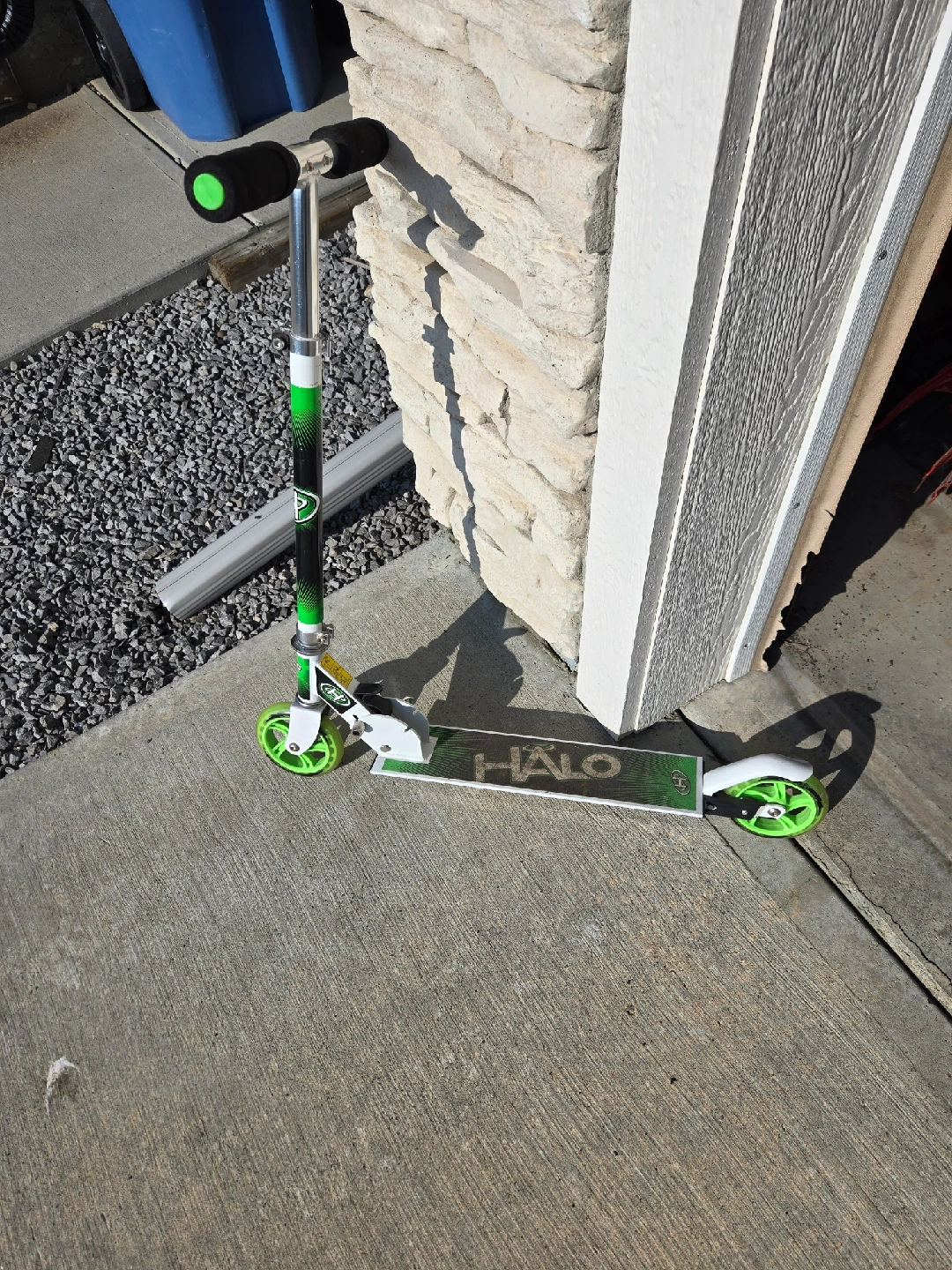 Selling a Halo kids' kick scooter in green and black. It's in good condition and ready for some fun rides! Perfect for kids who are learning to scoot around the neighbourhood or park. Price is firm.
