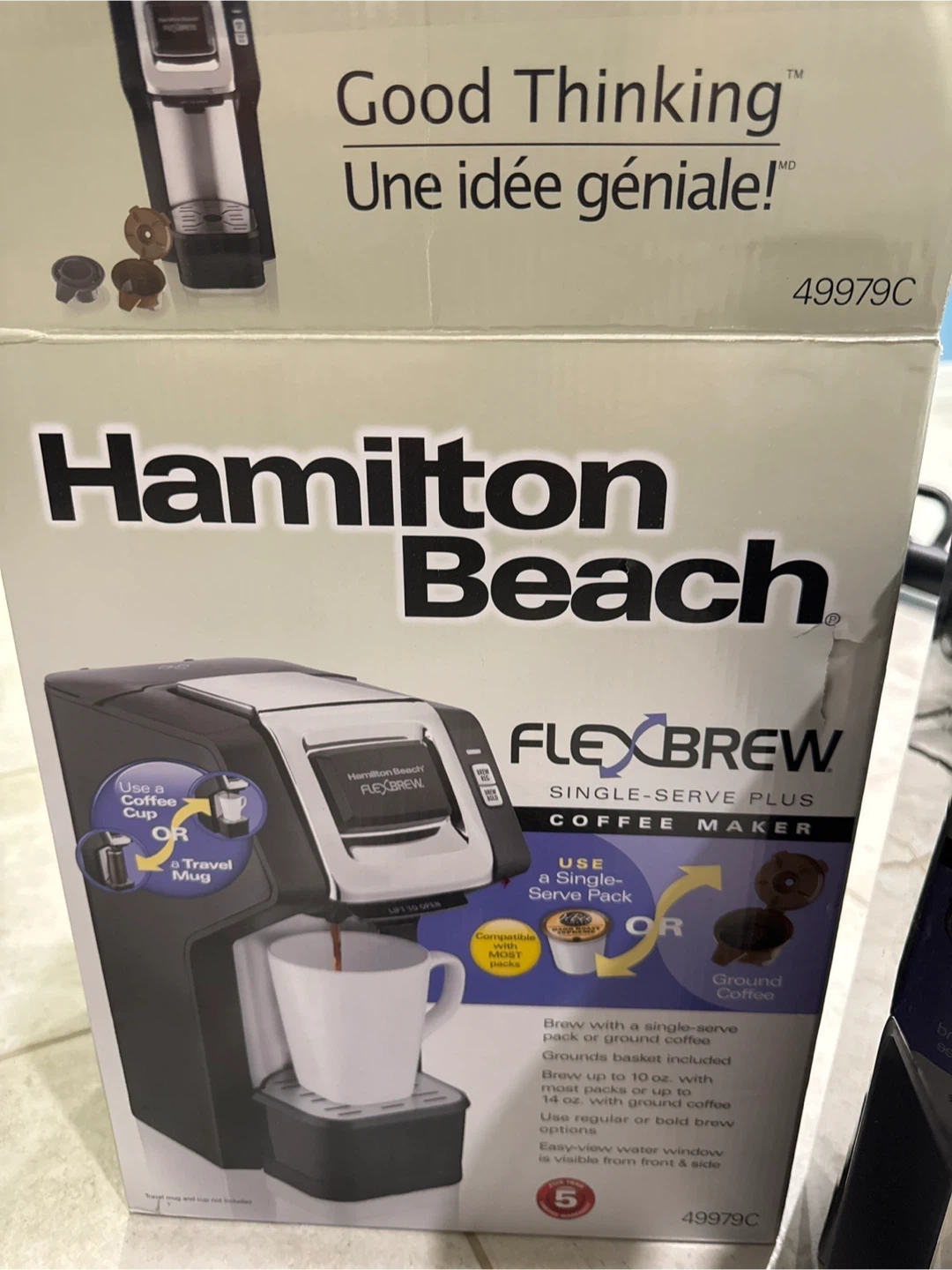 Selling a Hamilton Beach FlexBrew Single-Serve Plus coffee maker! It's in new , still in the box and ready to make your mornings easier. Brew with a single-serve pack or ground coffee. It can brew up to 10 oz with most packs or up to 14 oz with ground coffee. Use regular or bold brew options. Easy-view water window is visible from front and side