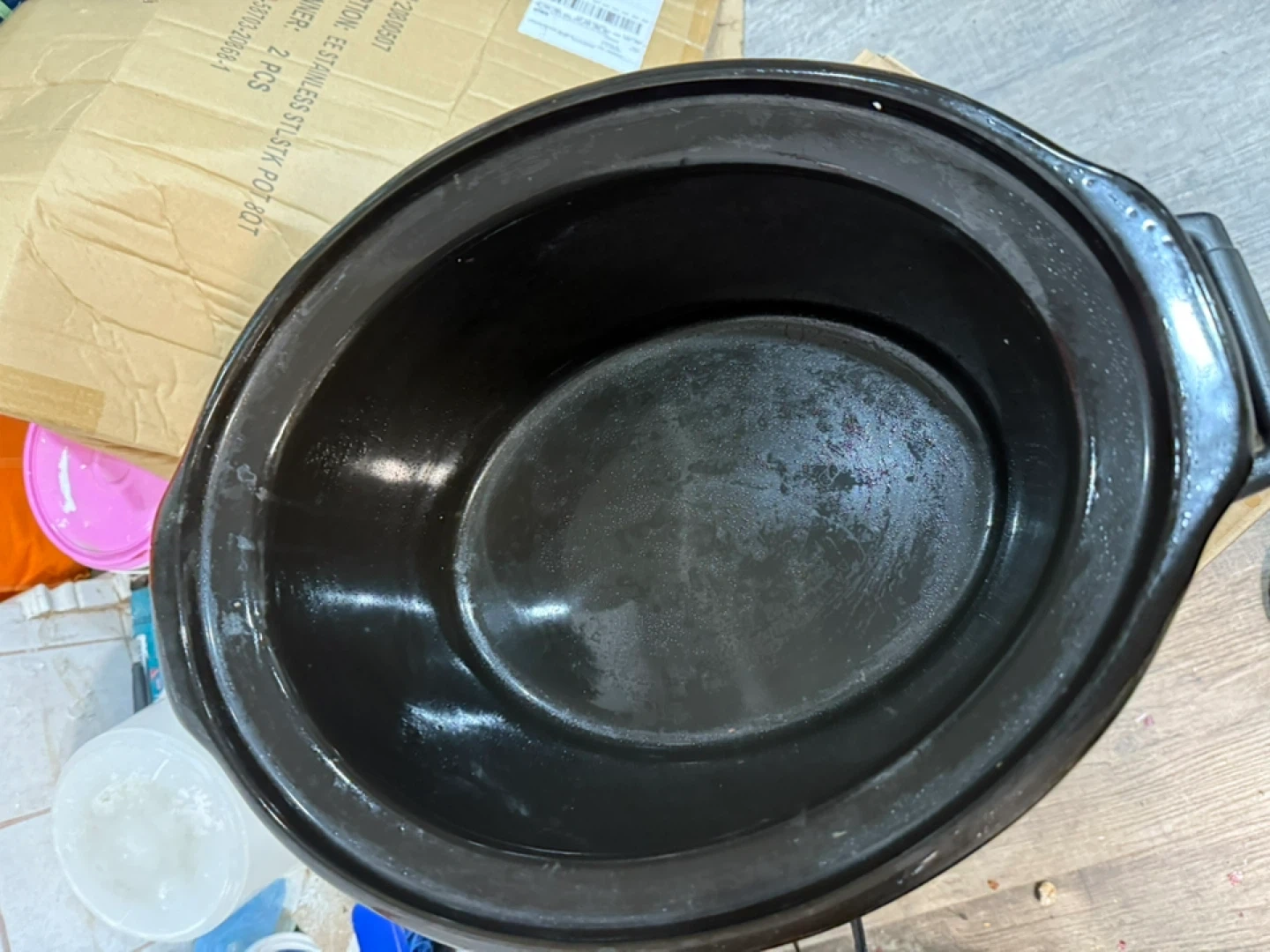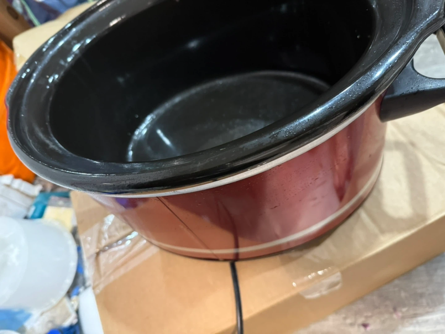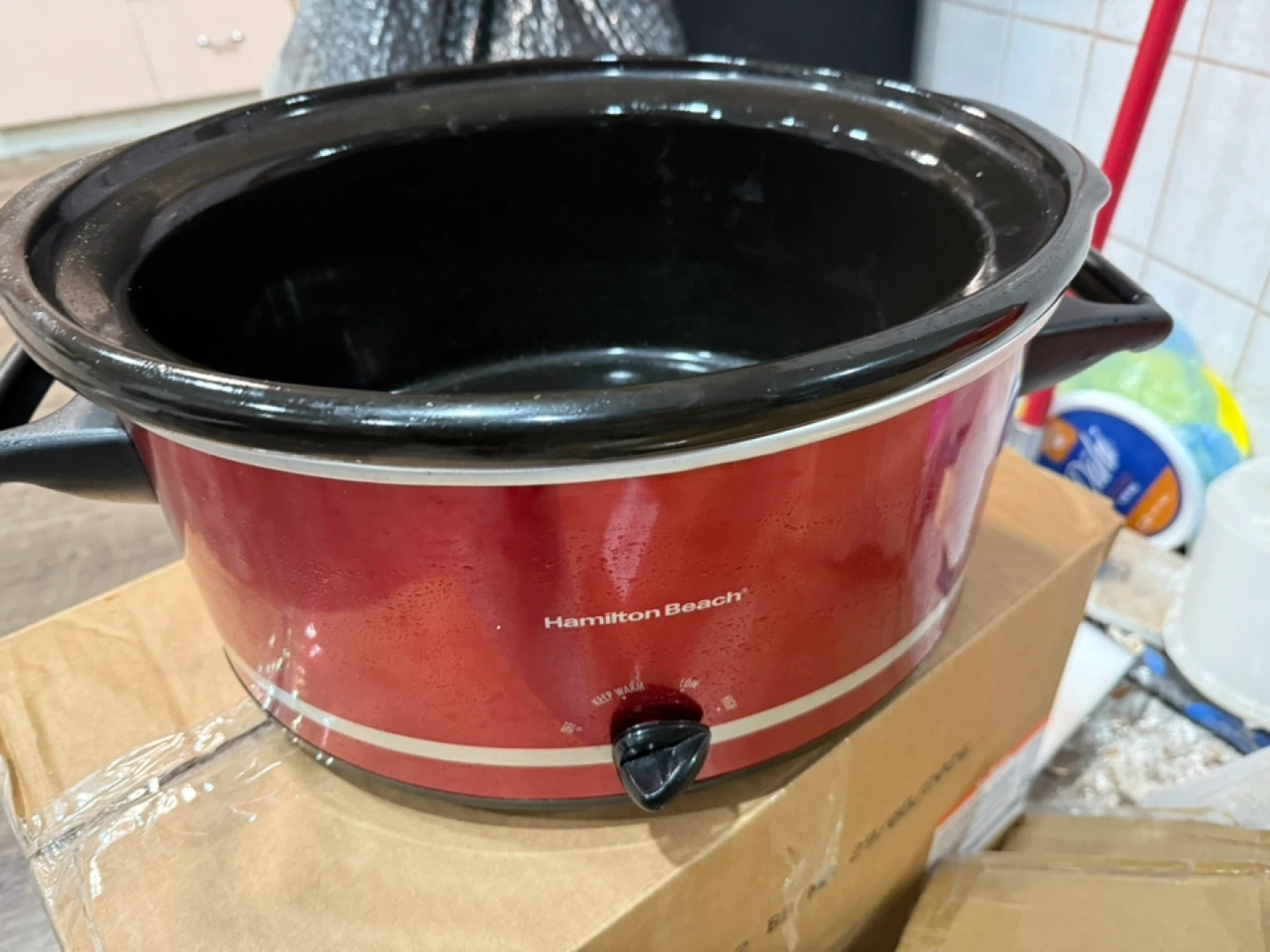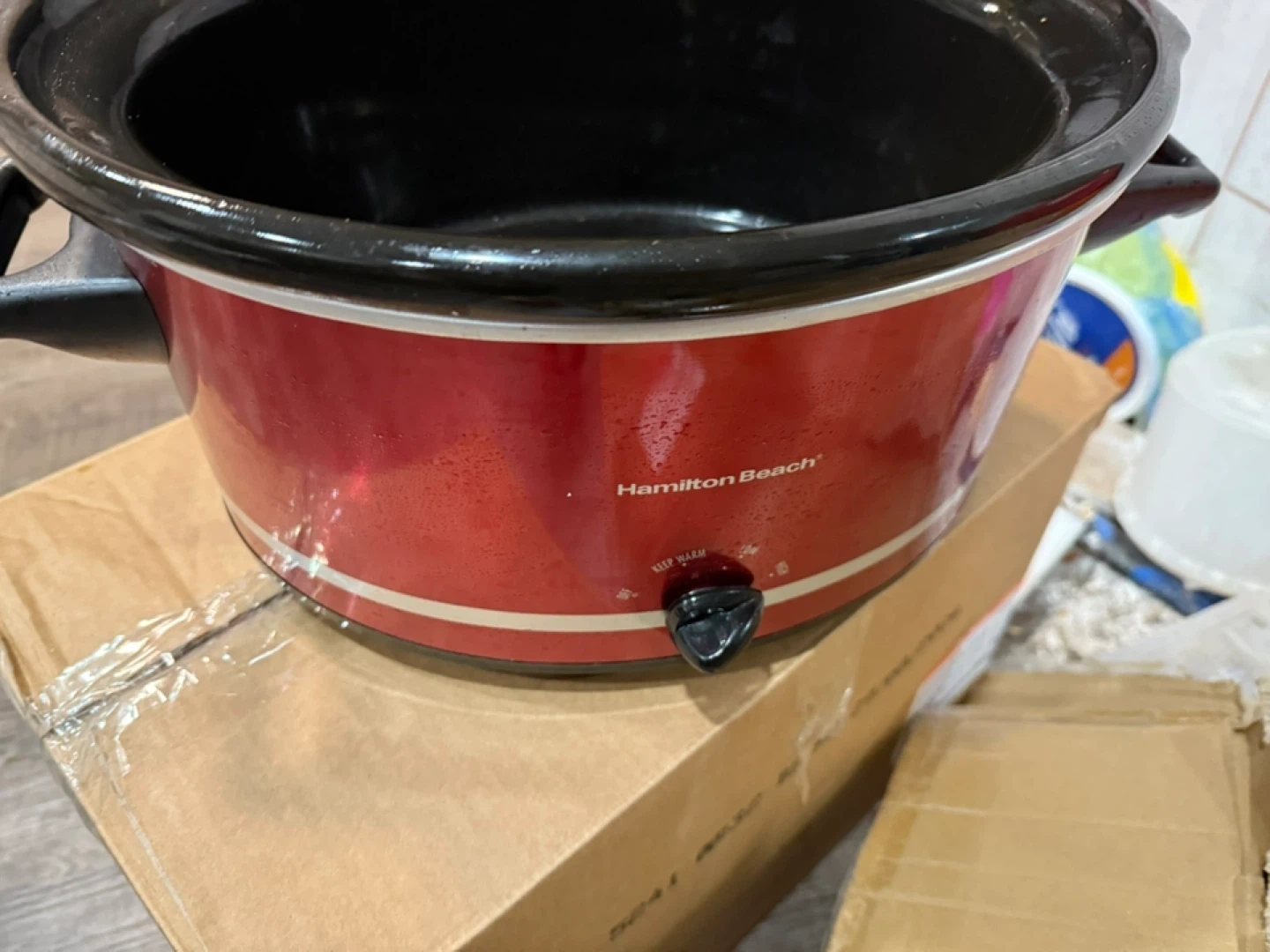 Selling a Hamilton Beach slow cooker. It's red and has a black interior. It has a keep warm setting.