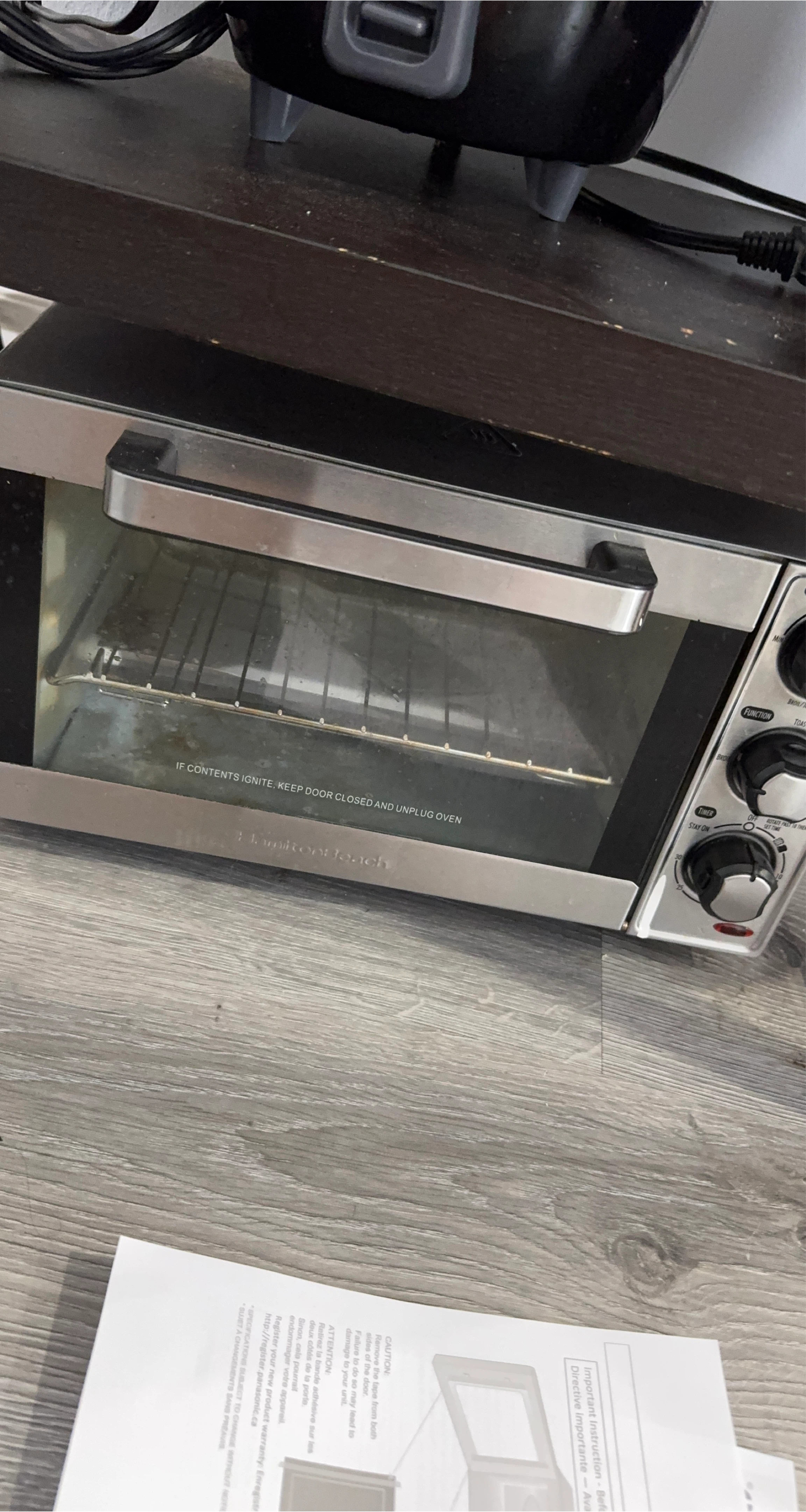 Selling a Hamilton Beach toaster oven. It's in good working condition and ready for a new home. It has multiple functions including broil, toast, and bake. Please keep the door closed and unplug the oven when not in use for safety