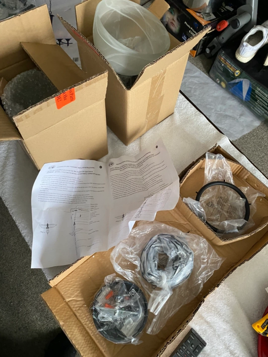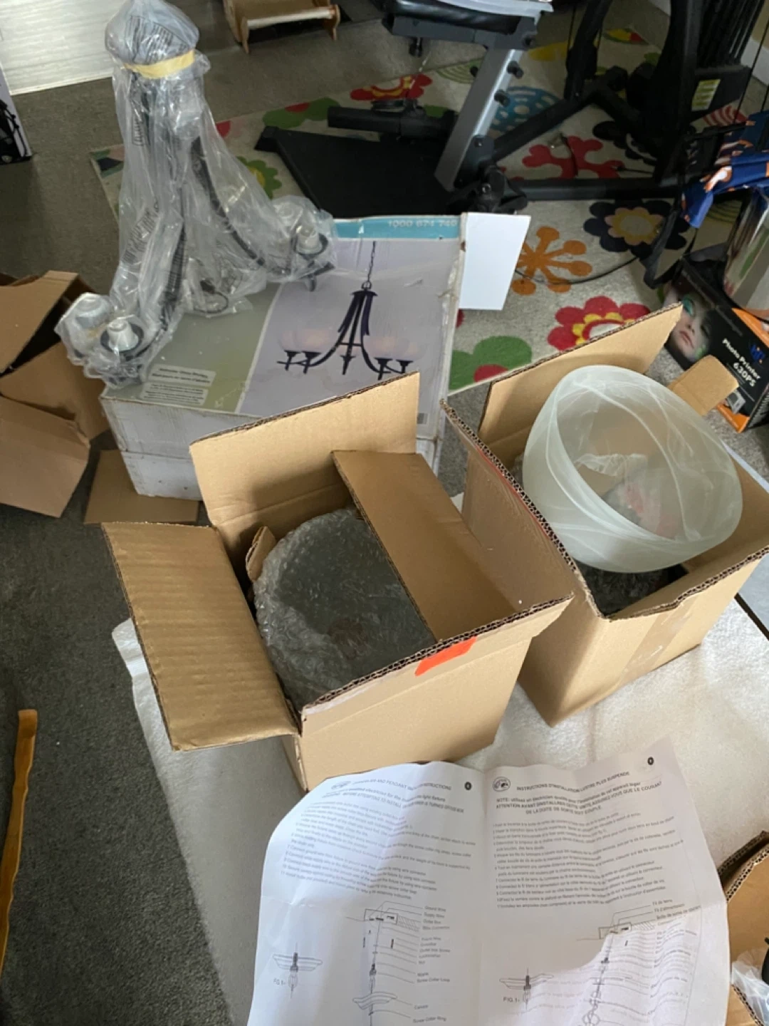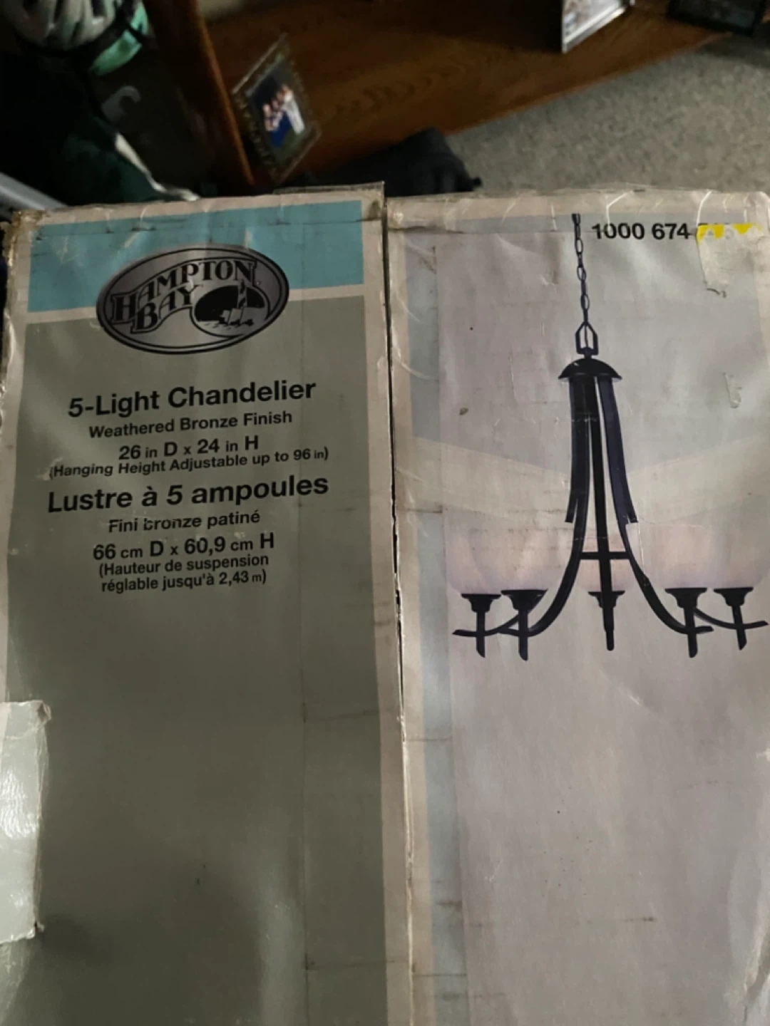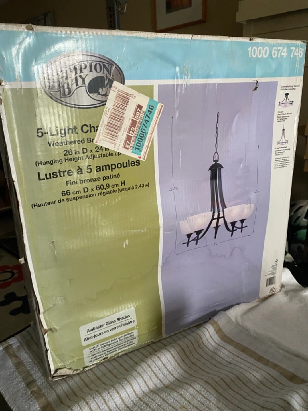 Selling a Hampton Bay 5-Light Chandelier with a weathered bronze finish. It's 26 inches in diameter and 24 inches in height, adjustable up to 96 inches. The chandelier features alabaster glass shades. Comes with all the components and instructions in the original box