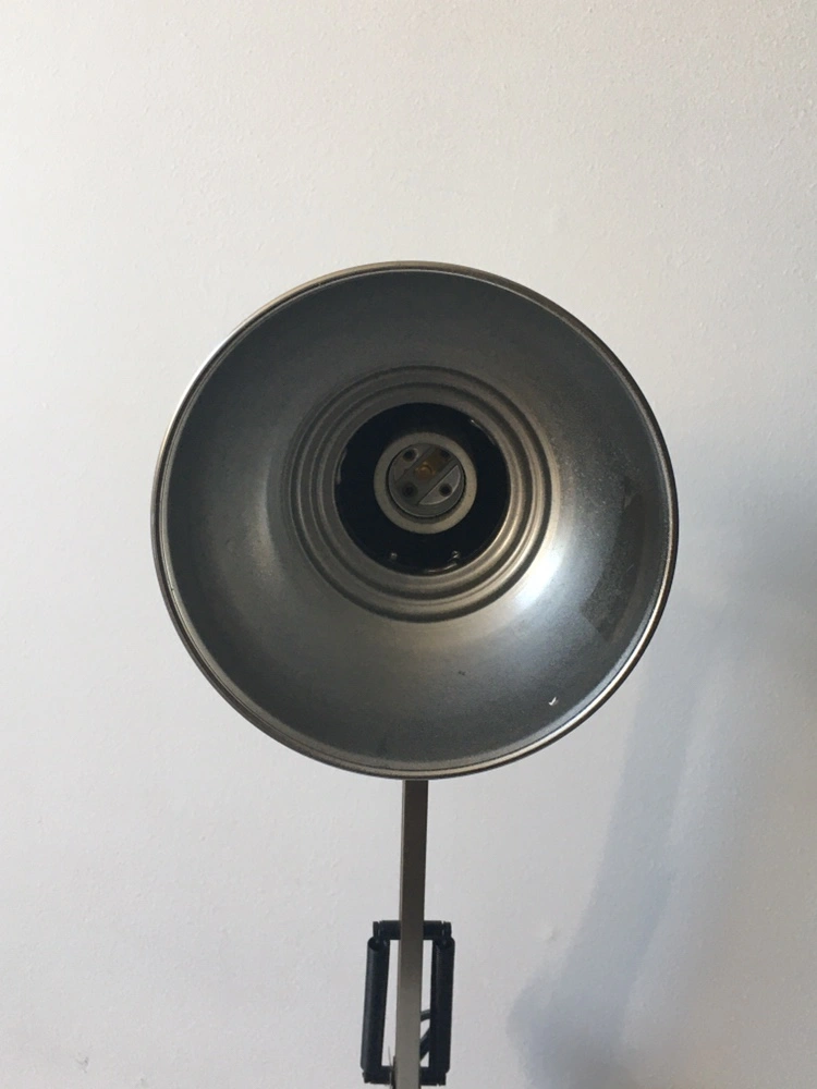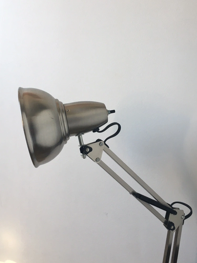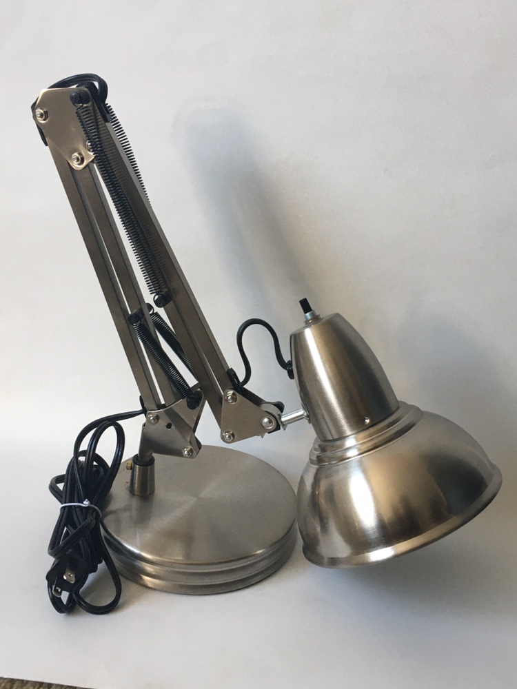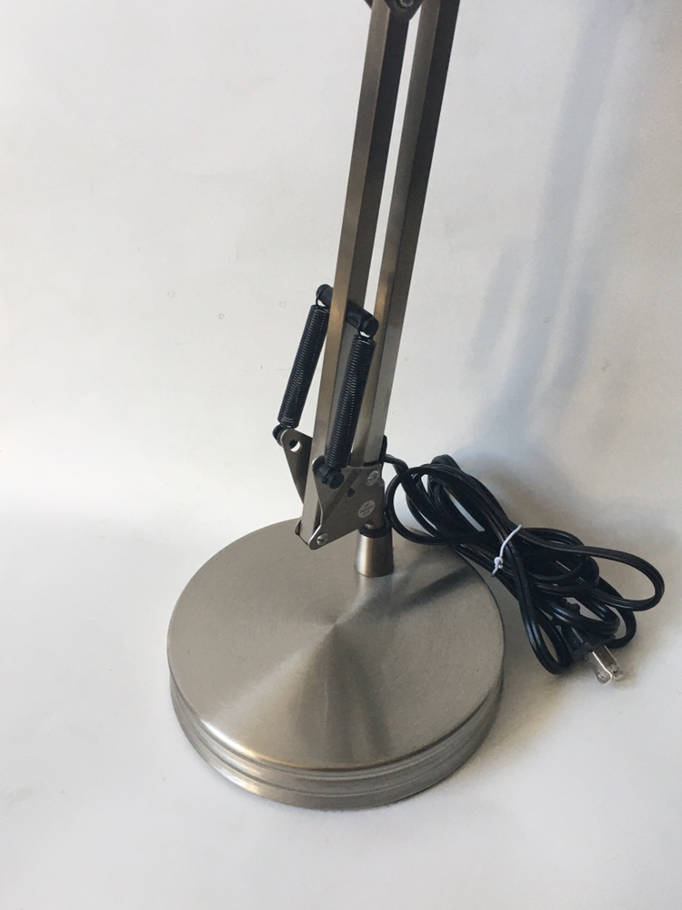 This desk lamp features a silver metal finish with a spring-loaded arm and a large shade. It includes a cord with a plug for easy use. Hampton bay portable lamp from home depot. pretty much brand new and never used. ideal for desks, seating and bedrooms areas Specs: model # HBP1017D-109 Satin chrome finish On/off switch Metal shade Iron construction