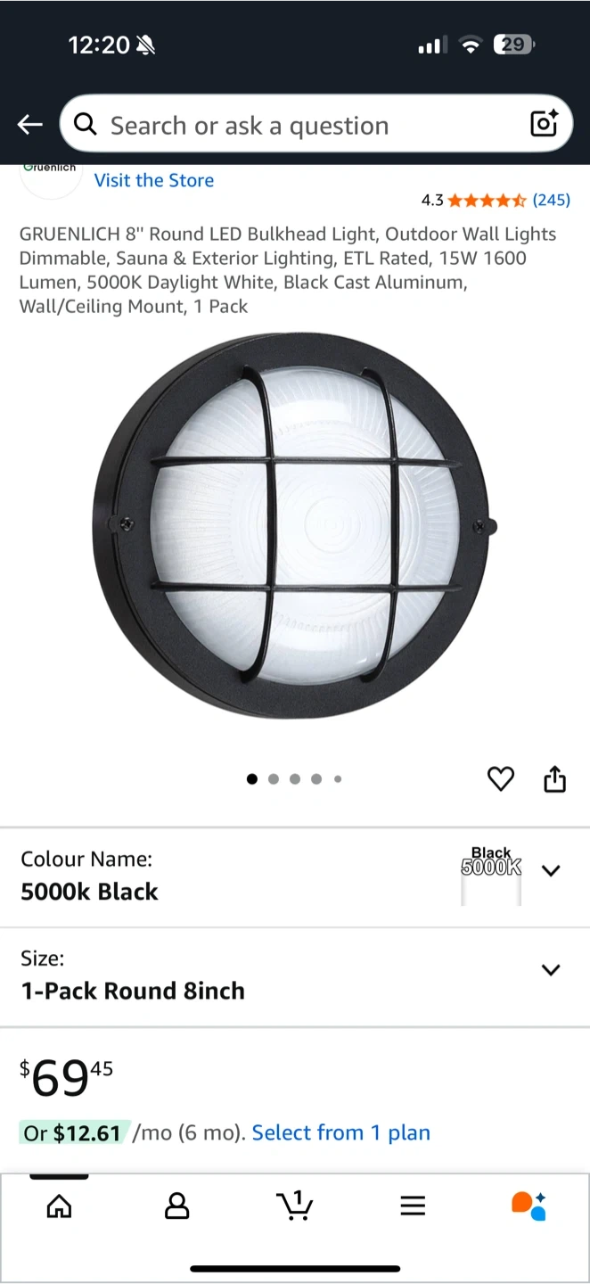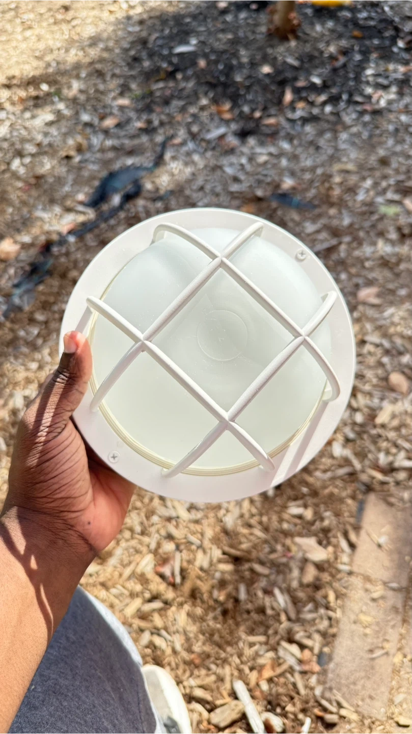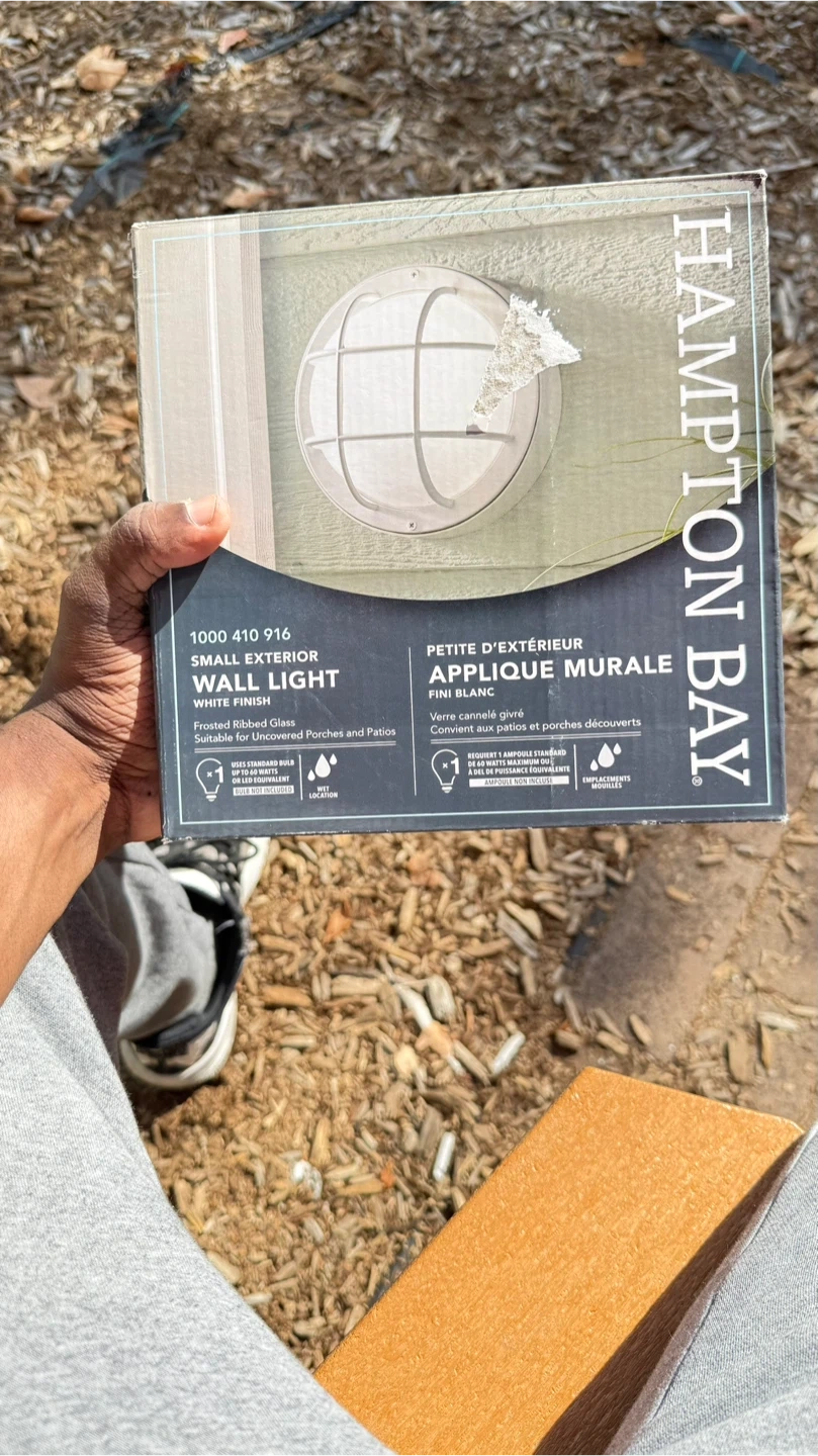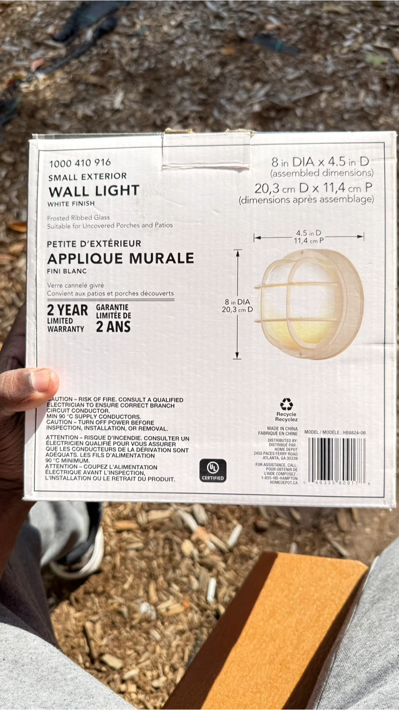 Selling a Hampton Bay small exterior wall light. It's white with frosted ribbed glass. Suitable for uncovered porches and patios. It is 8 inches in diameter and 4.5 inches deep. Includes all the necessary hardware for installation