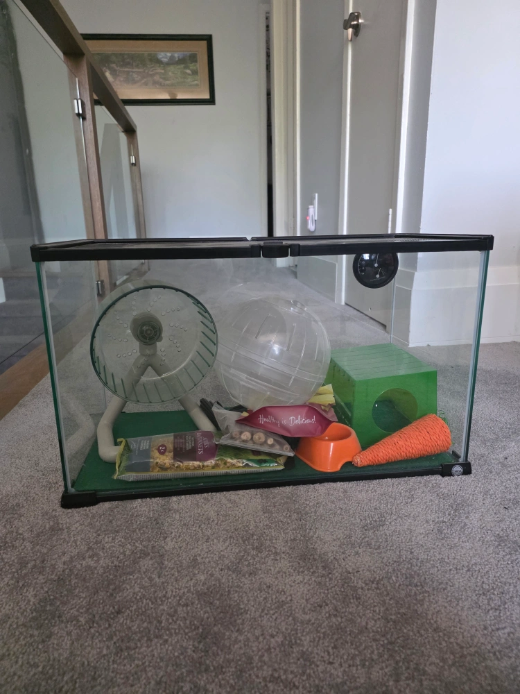 Selling a hamster cage with accessories! Includes: - Hamster wheel - Hamster ball - Food bowl - Water bottle - Hideout - Oxbow Simple Rewards Apple & Banana treats - Green Chews - Sticks Batonnet treats