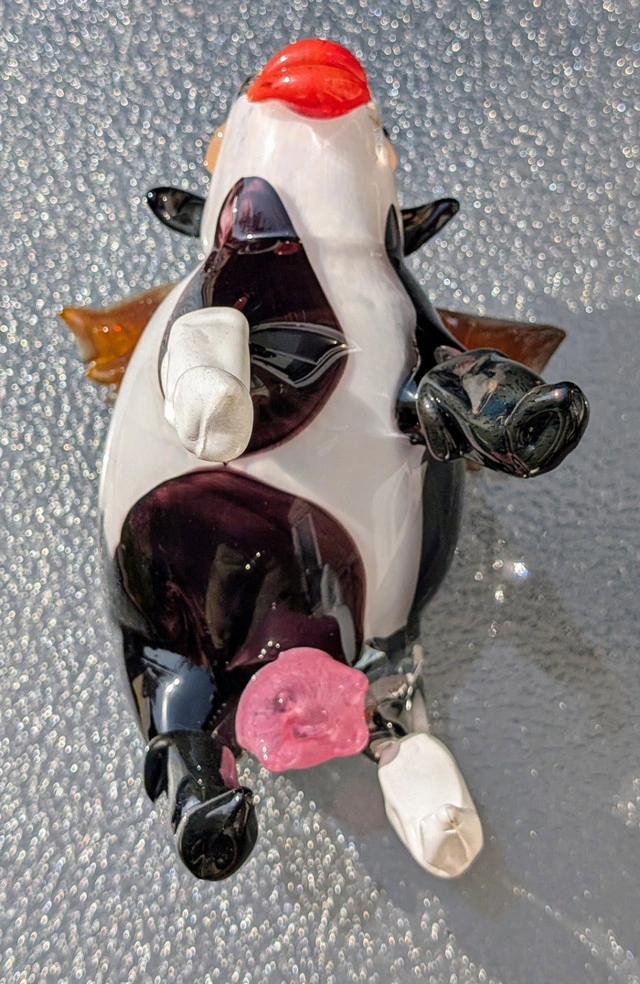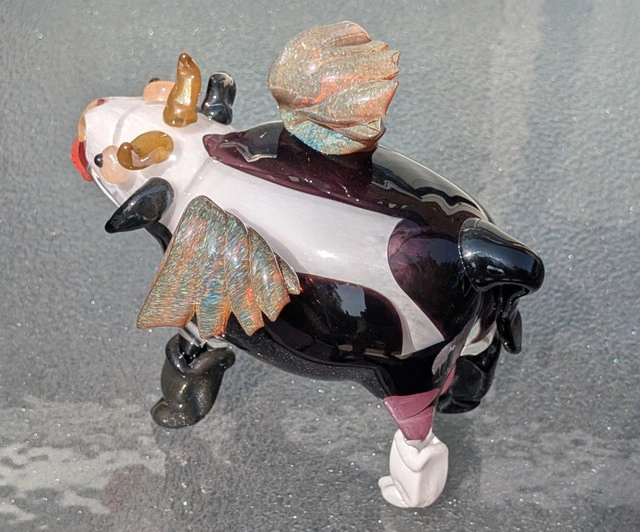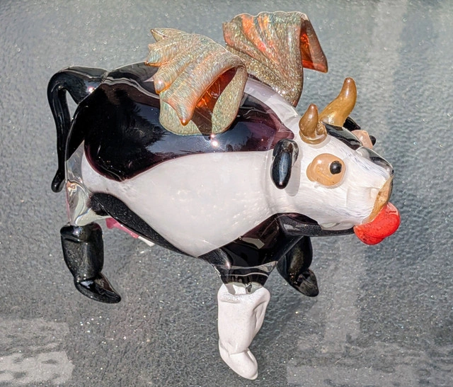 If you are seeing this Ad, then this item is still available This sale is for 1 very nice and clean Hand Blown Ontario Craft Glass Cow by Paulus Tjiang - Highly Collectible. This whimsical winged cow is a standout piece by Paulus Tjiang, a master glassblower based in Warkworth, Ontario. Known for his playful and expressive designs, Tjiang often blends everyday animals with fantastical elements—like this cow with iridescent wings and a cheeky pink tongue. It measures approximately 6.5" long, 4.5" wide and 6.5" high. Weight: 1212g (2.67 lbs) Design Highlights: • Classic black-and-white cow pattern with mismatched legs—twoblack, two white—adding to its quirky charm • Golden horns and a protruding pink tongue give it personality and humor. • Shimmering glass wings elevate the piece into the realm of myth and imagination About the Artist: • Paulus Tjiang studied at the Ontario College of Art and trained at the Pilchuck Glass School, where he was influenced by Venetian glass techniques and artists like Lino Tagliapietra • He opened his own studio at Frantic Farms in Warkworth, Ontario, where he and his wife, potter Monica Johnston, showcase their work • His glass art often blends modern design, vintage whimsy, and pop culture references Collectibility: • Handcrafted charm: Each piece is hand-blown and sculpted at Frantic Farms Studio in Warkworth, Ontario • Distinctive style: Tjiang’s work blends Venetian glass techniques with playful, character-driven designs inspired by pop culture and modern art • Limited availability: His animals are one-of-a-kind and hand-blown, making them rare finds Pick-up in Pickering ONLY This item comes from a smoke-free home.