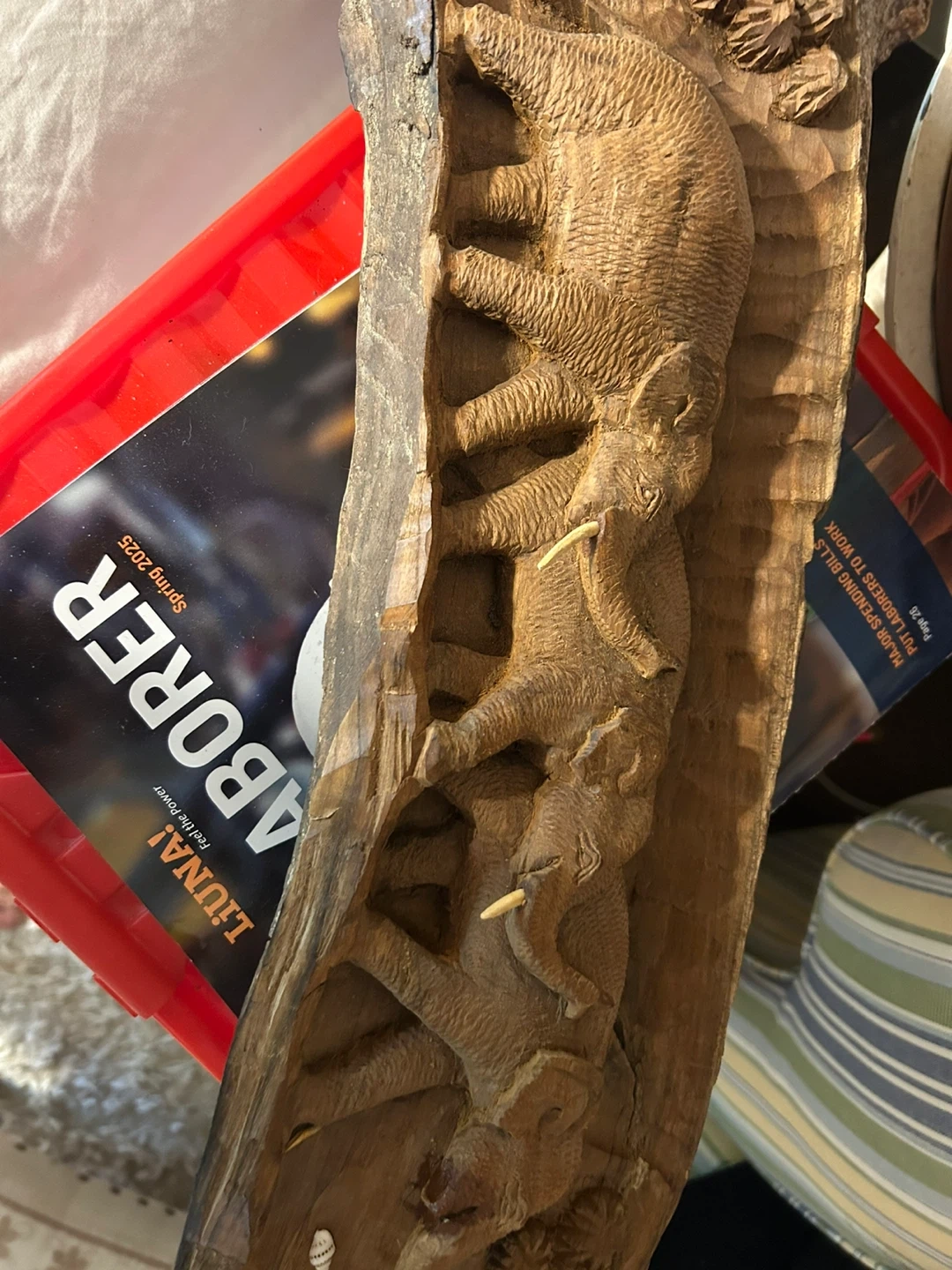 Selling a unique hand-carved wooden sculpture featuring elephants. It's a beautiful piece of art that would add a touch of nature to any room