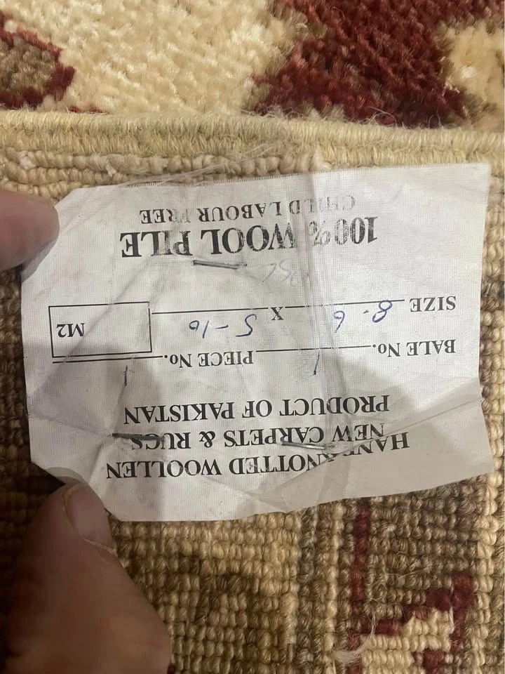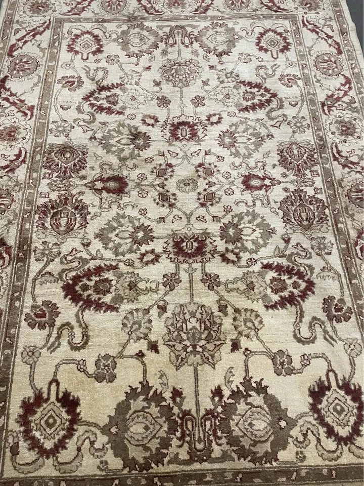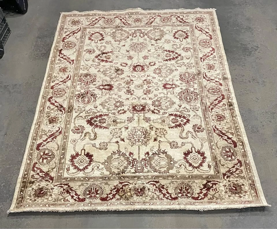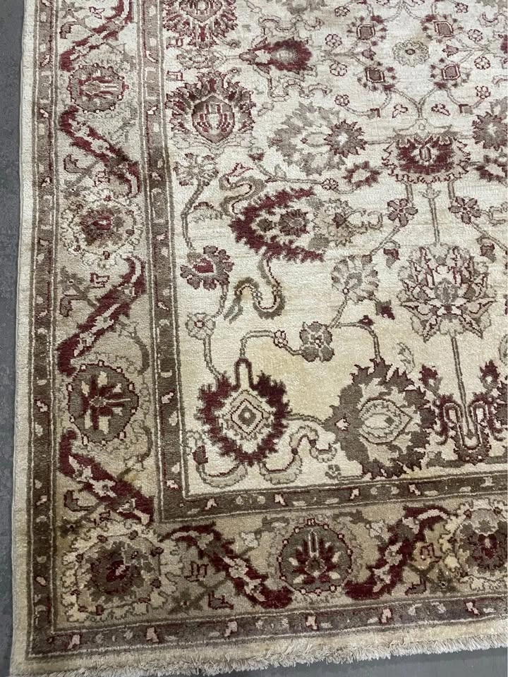 This hand knotted wool rug is in very good condition. It measures 8’6” x 5’10” and is ivory and red in colour. This quality piece is made in Pakistan. Pick up in Chestermere