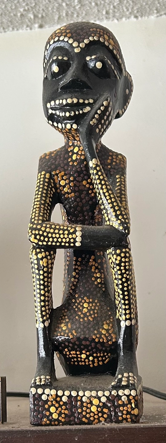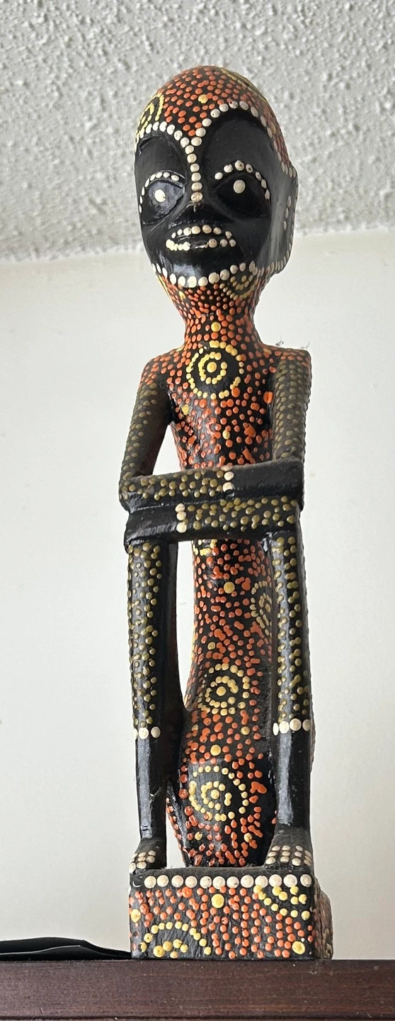 Unique wooden figurine. Hand-painted in Aboriginal dot-art style. Dark brown and black base colour with yellow and orange dots. Seated position. Collectible or decorative piece. Set of 2