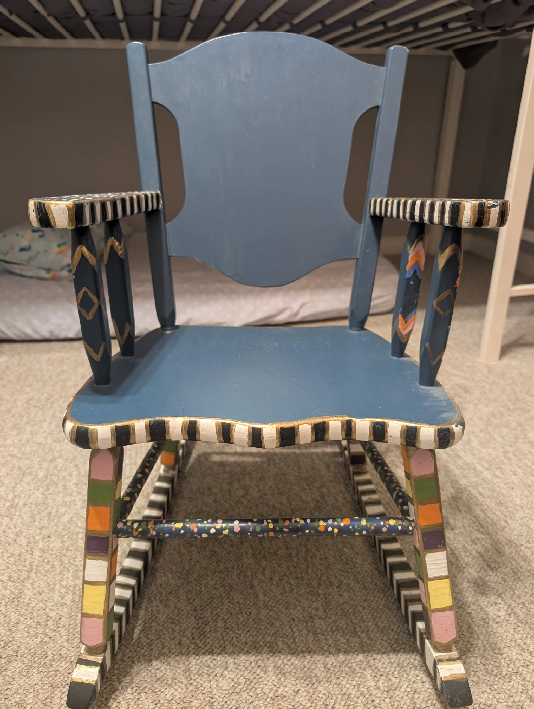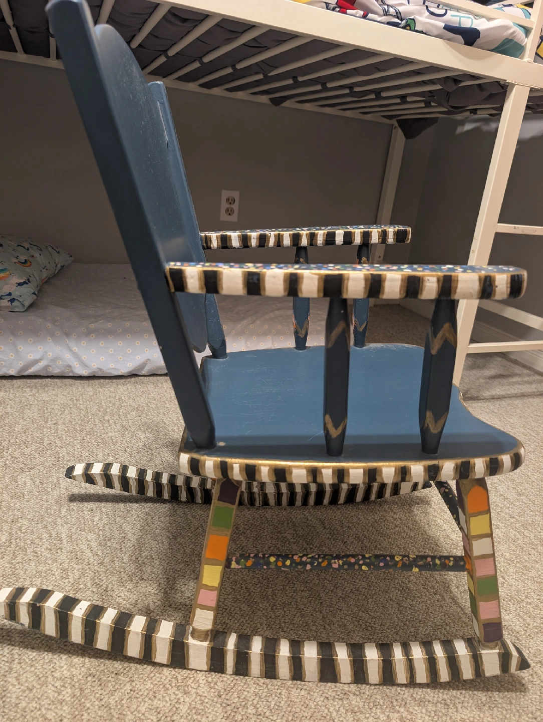 This adorable children's rocking chair is hand-painted with a unique and playful design. It's sturdy and perfect for a kid's room or playroom. The chair is in good condition and ready for a new home!