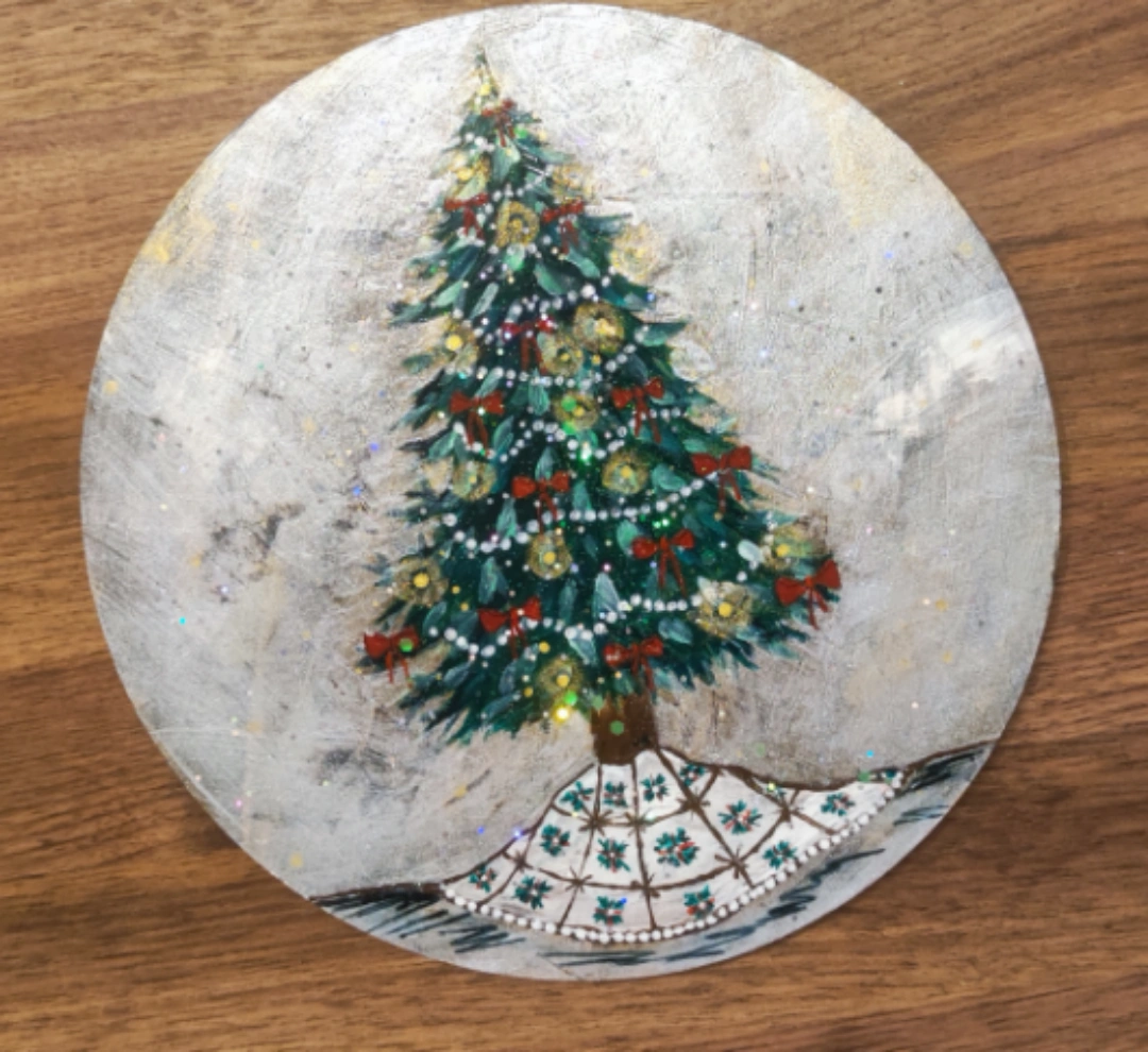 Round ornament with a painted Christmas tree. Glittery silver background. Unique holiday decor.