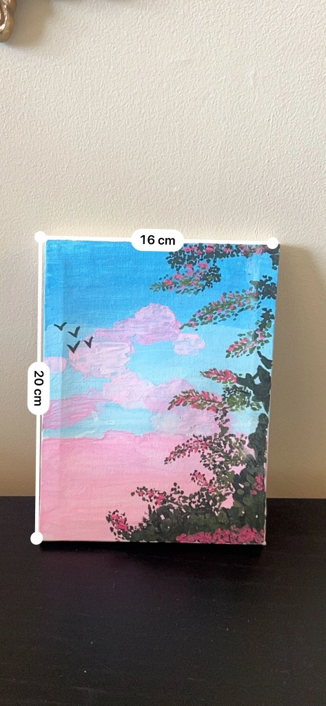 This is a hand painted canvas art piece depicting a beautiful floral landscape with birds. The dimensions are 16 cm x 20 cm. It would be a great addition to any room!