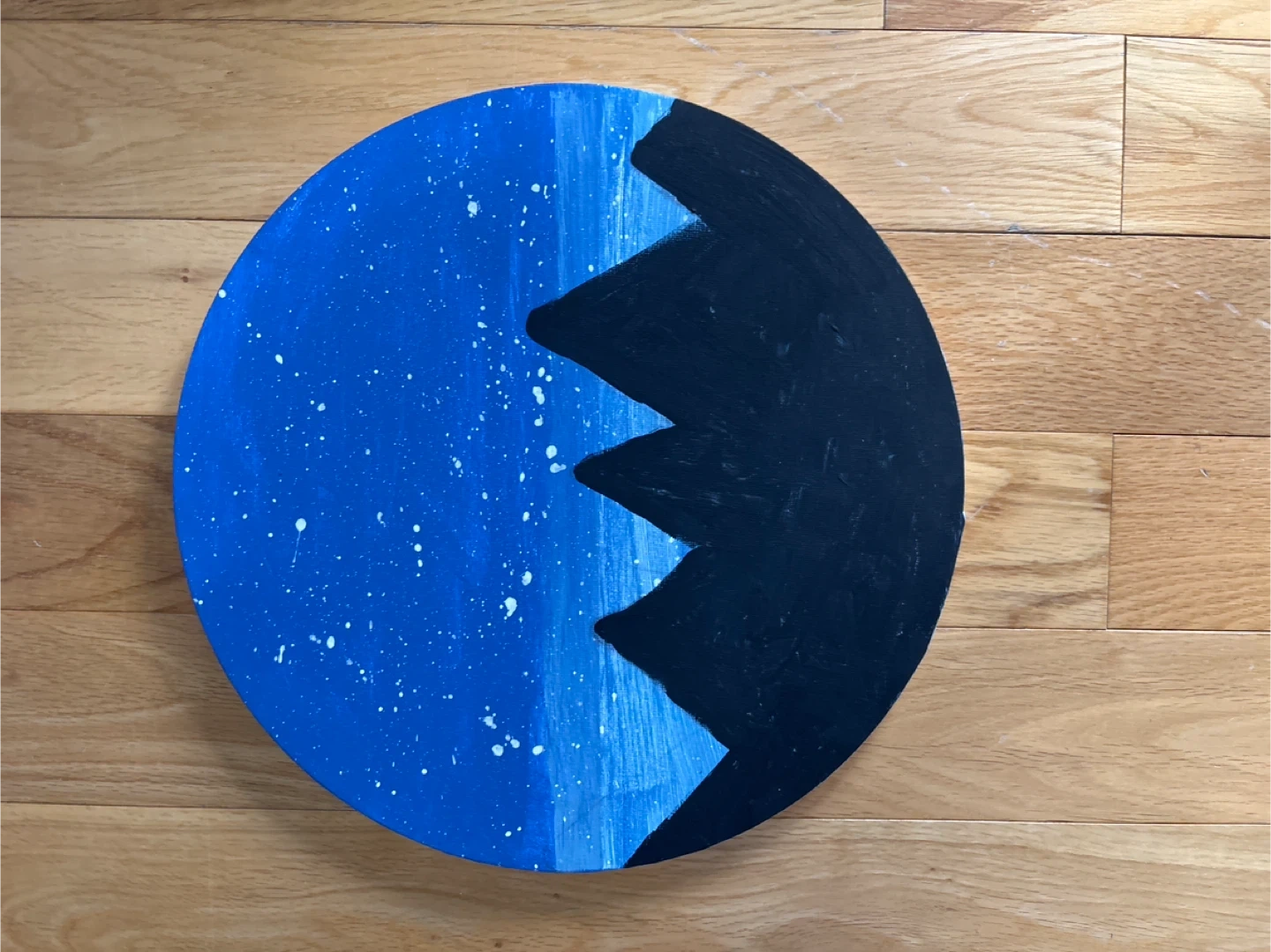 This is a hand-painted wall art piece, featuring a moon phase design in blue and black. It would be a nice addition to any room!