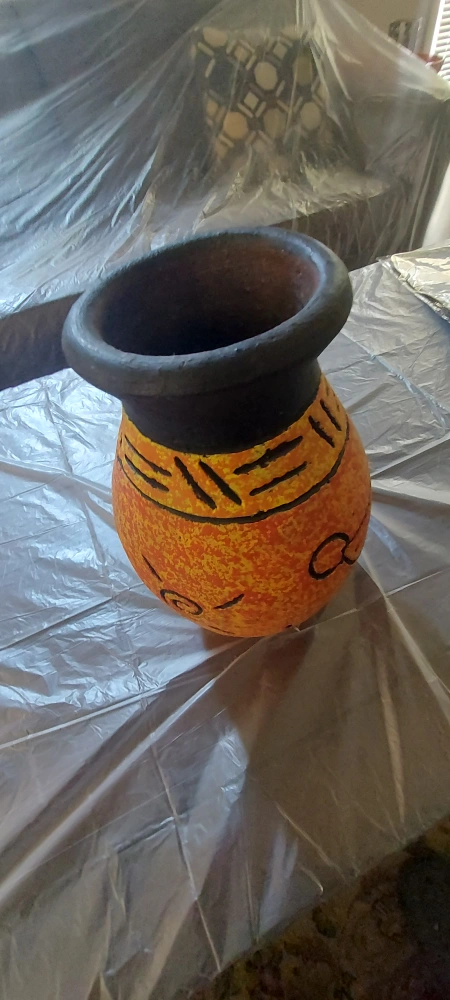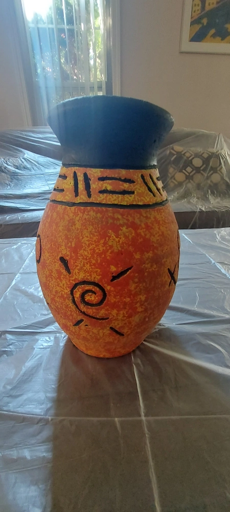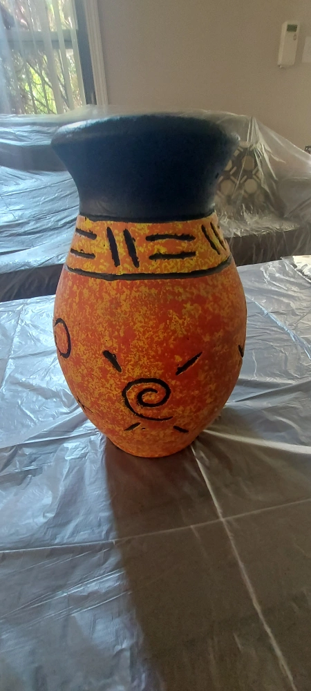 I'm selling a unique, hand-painted vase. It features a vibrant orange base with black detailing and a dark blue top. Perfect for adding a pop of colour to any room! Cash only!!