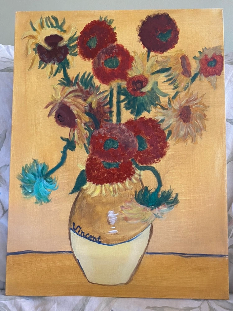 Acrylic painting based off of Vincent Vangoh’s Sunflower painting. 24”x18”