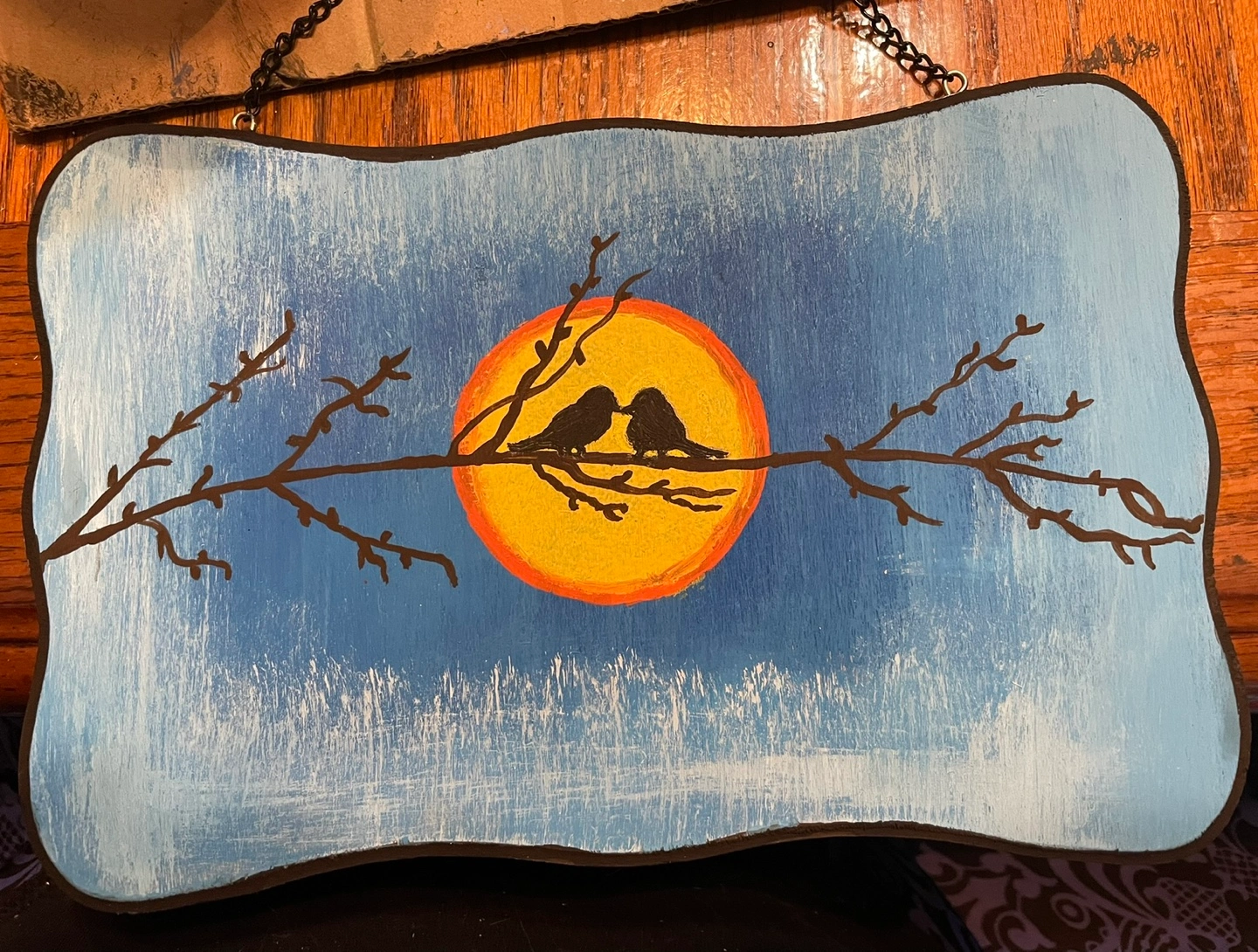 A hand painted wooden sign featuring two birds on a branch in front of a sun. It has a blue and white background with an orange sun. The sign is perfect for adding a touch of rustic charm to your home. Original painting. Signed with description on back.