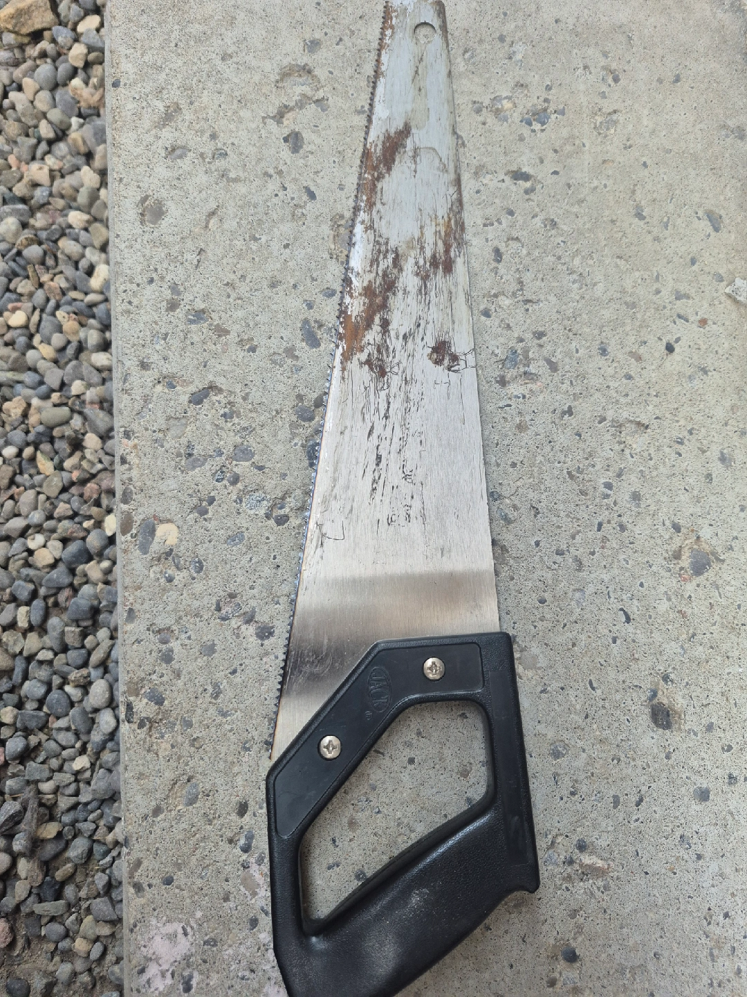 Selling a hand saw with a black handle. The blade shows some signs of wear, but it's still functional. Great for small projects around the house