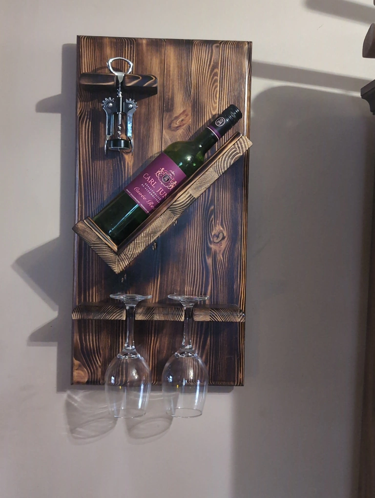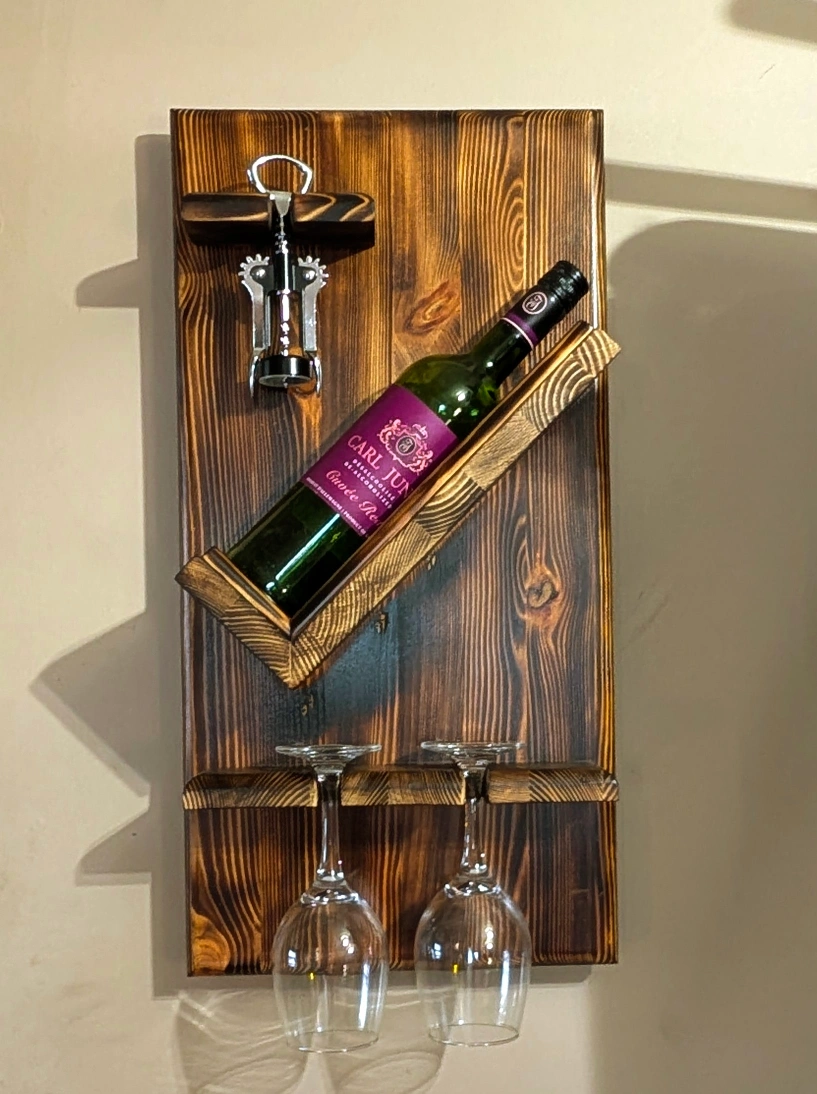 Add warmth and style to your space with this beautifully crafted wall-mounted wine rack. Standing 24" tall, it’s made from richly grained wood with a dark, burnt finish—perfect for cozy kitchens, farmhouse dining rooms, or stylish home bars. Designed to hold one wine bottle, a corkscrew and two glasses, it’s compact yet visually striking; adding both charm and practicality. ✨ A stunning gift for housewarmings, weddings, or anniversaries—and a must-have for wine lovers and décor enthusiasts alike!